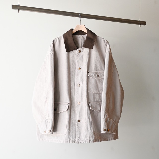 25SSシーズンに大好評だったカバオールが新色で再び登場。 程よいハリ感のあるコットンキャンバス地に硫化バイオ加工を施したことでヴィンテージのような渋みのある表情に仕上がっております。 ゆったりオーバーなシルエット、全体のワークな雰囲気に表襟にはウルトラスエードを採用した「上品さ」のアクセントも加わったアイテム。同ブランドらしいアクションプリーツと立体的なアームはインナーを着込んだ際にも身体に沿う快適な着心地で、春先までガシガシ着ていただきたい逸品です。 color : M.beige material : COTTON 100% other : POLYESTER 88% , POLYURETHANE 12% collection : URU TOKYO 25AW size : 1 着丈 72cm 肩幅 56cm 身幅 73cm 袖丈 57cm size : 2 着丈 74cm 肩幅 58cm 身幅 74cm 袖丈 59cm size : 3 着丈 77.5cm 肩幅 59cm 身幅 76cm 袖丈 60cm ※撮影の環境上実際の色味とは多少異なる場合がございます。
