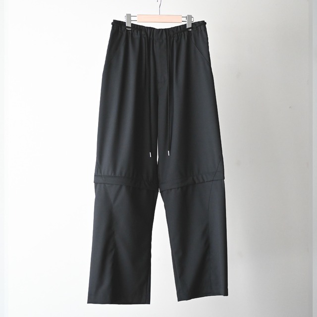 膝下に施されたジップを切り離すことによってショーツへ変形するデタッチャブル式パンツ。 ベルトループに通されたゲームパンツ風の紐を結んで履いていただくイージー仕様ですが、ウールとポリエステルによってスラックスのような上品さも兼ね備えたビジュアルにまとまっております。 夏場にはショーツとしても活躍するシーズンレスなアイテムです。 color : BLACK material :WOOL 50%, POLYESTER 50% collection : COGNOMEN 25AW size : L ウエスト 74-84cm (ウエストがゴムの為伸ばしたサイズも計測しております) 股上 34.5cm 股下 76cm 裾幅 28cm ※撮影の環境上実際の色味とは多少異なる場合がございます。