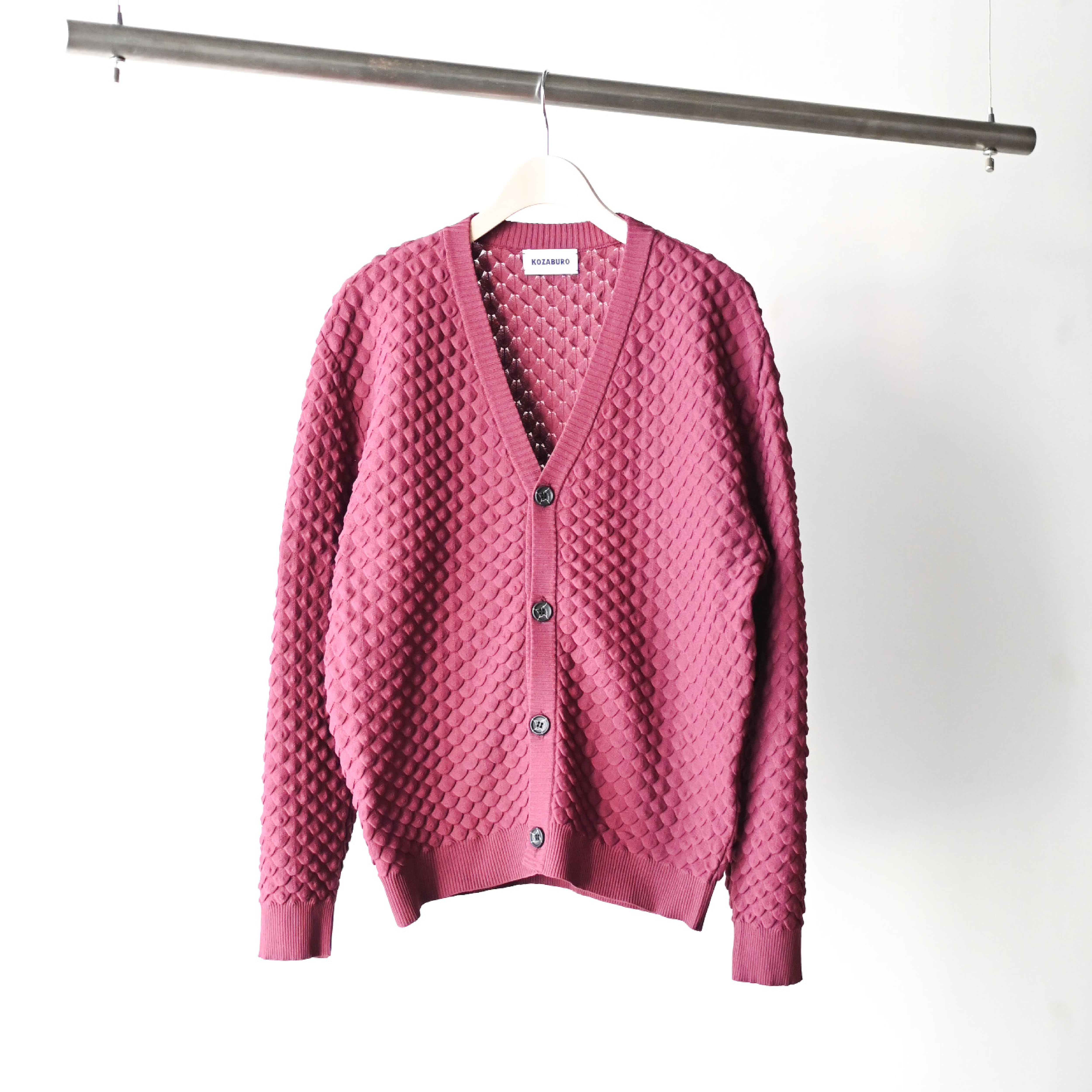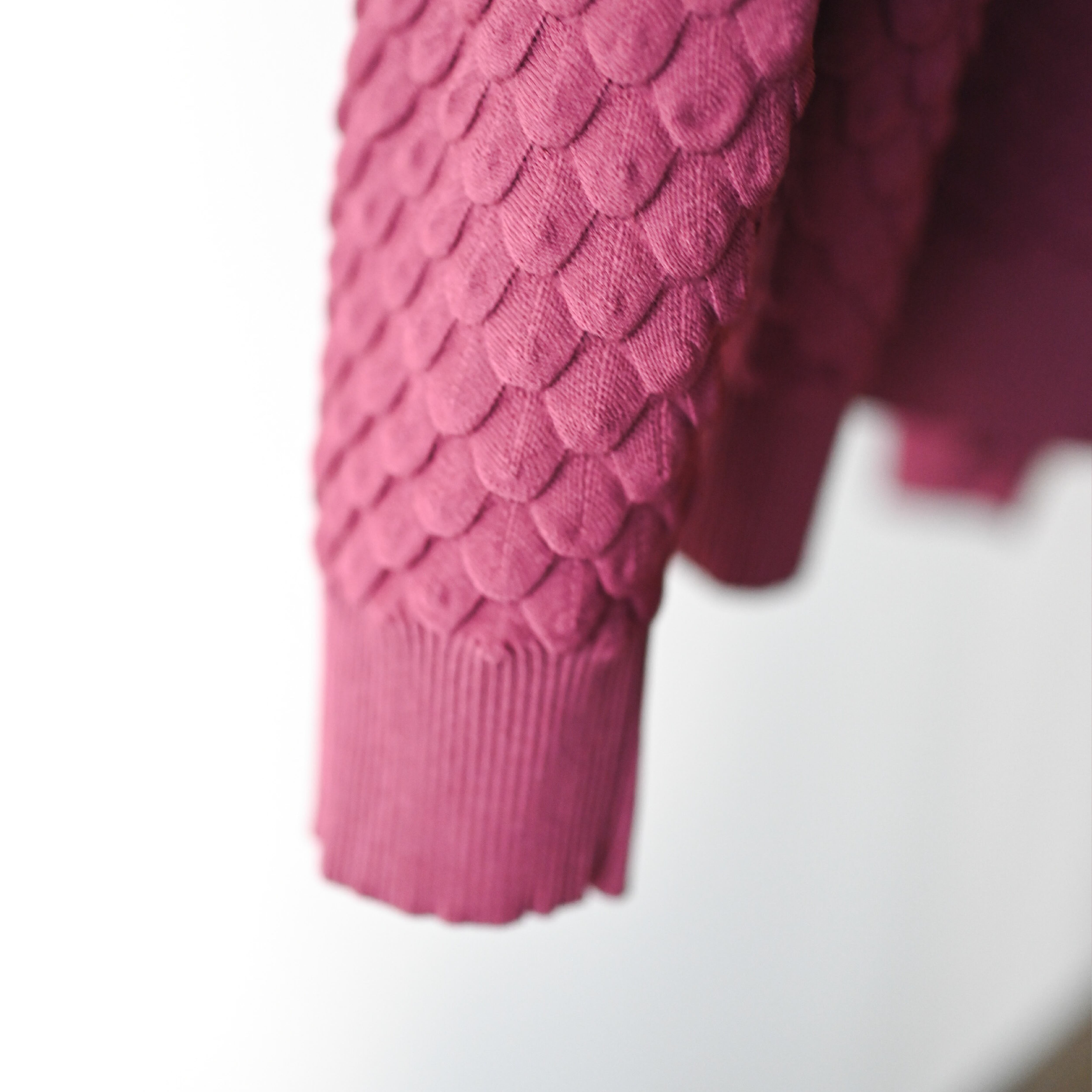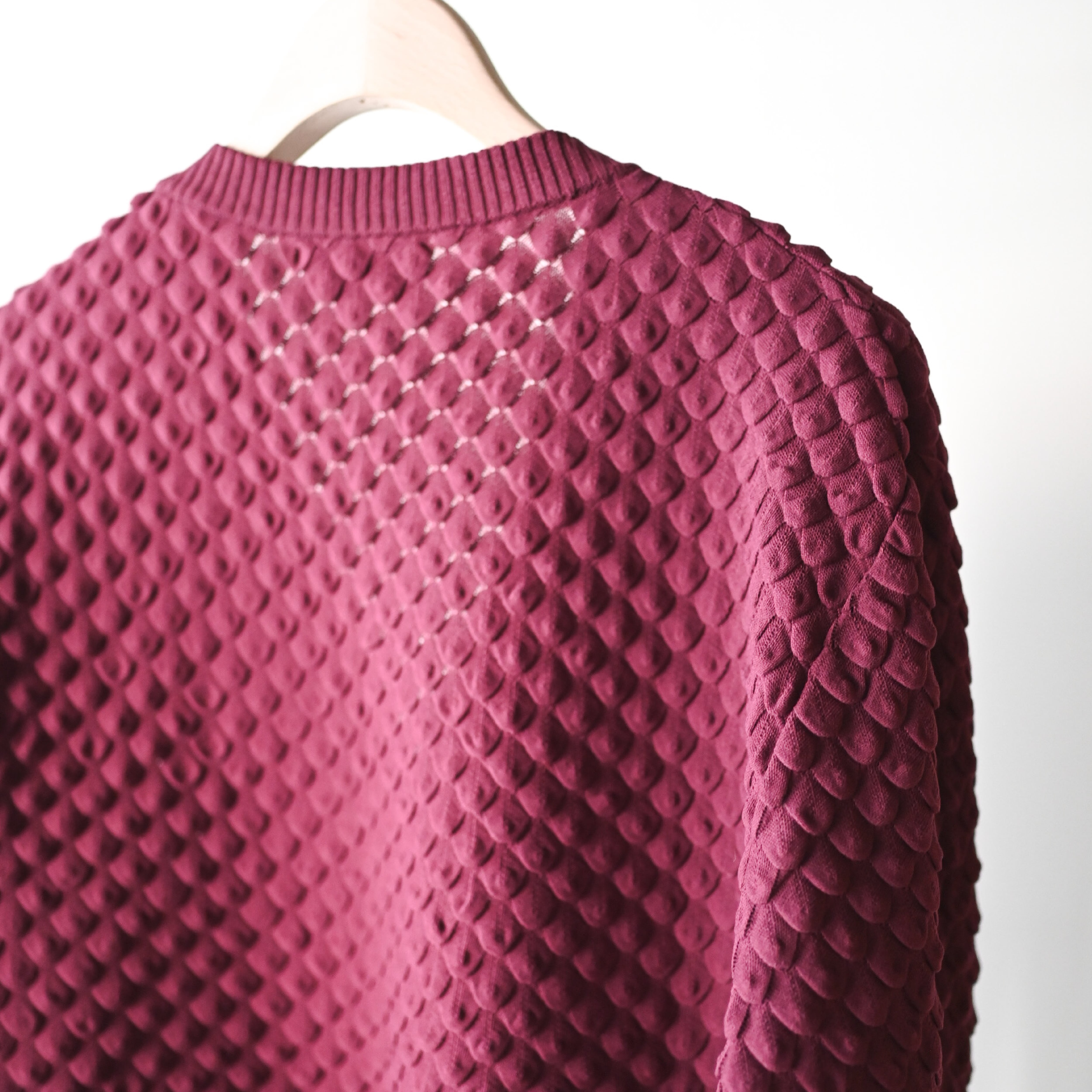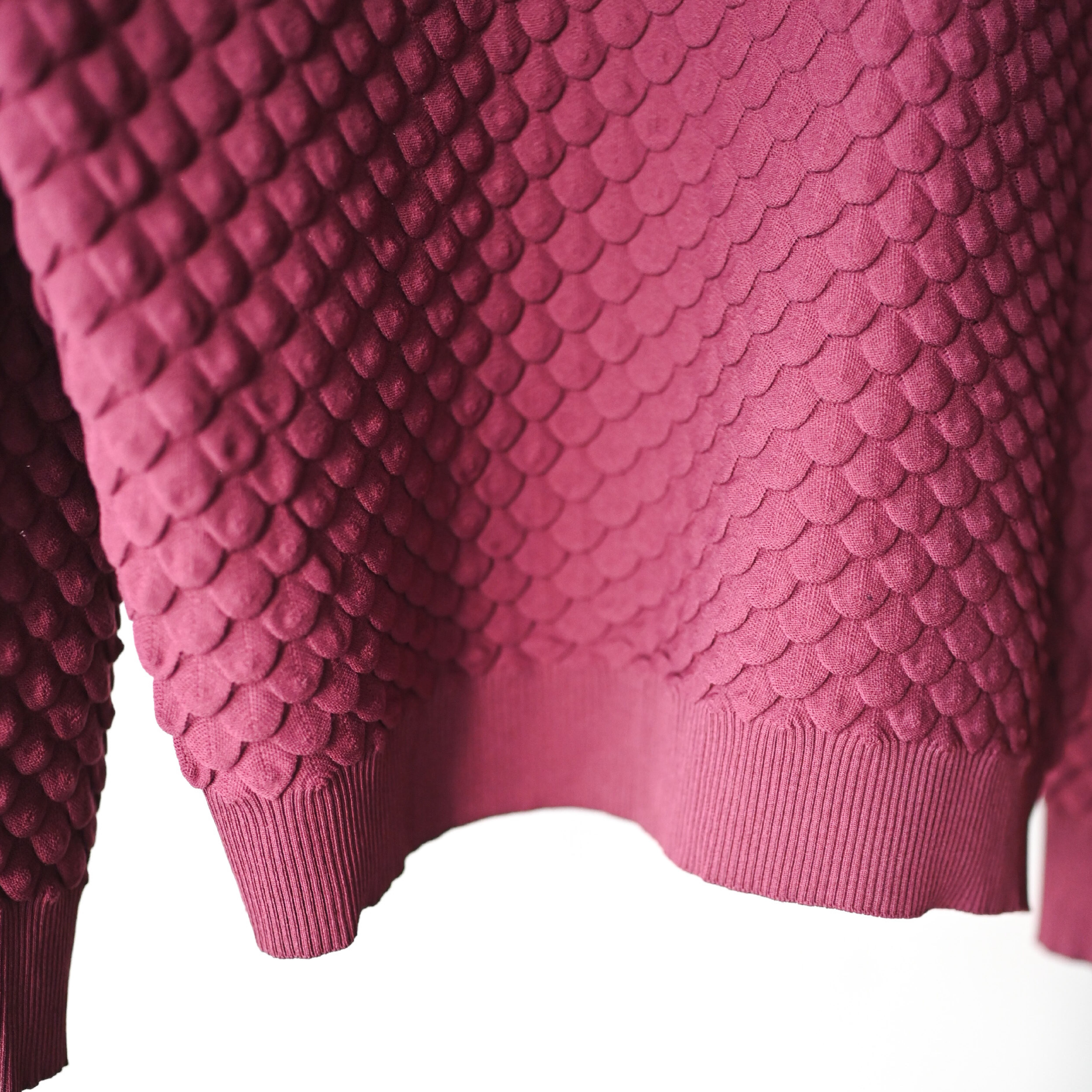 まるでドラゴンの鱗のような質感を持つ立体感のある生地使いのカーディガン。しかしながら深いワインレッドの色味や着物の柄のような品も漂わせる大人仕様で、同ブランドの世界観をしっかりと感じられる独特のバランス感に仕上がっております。