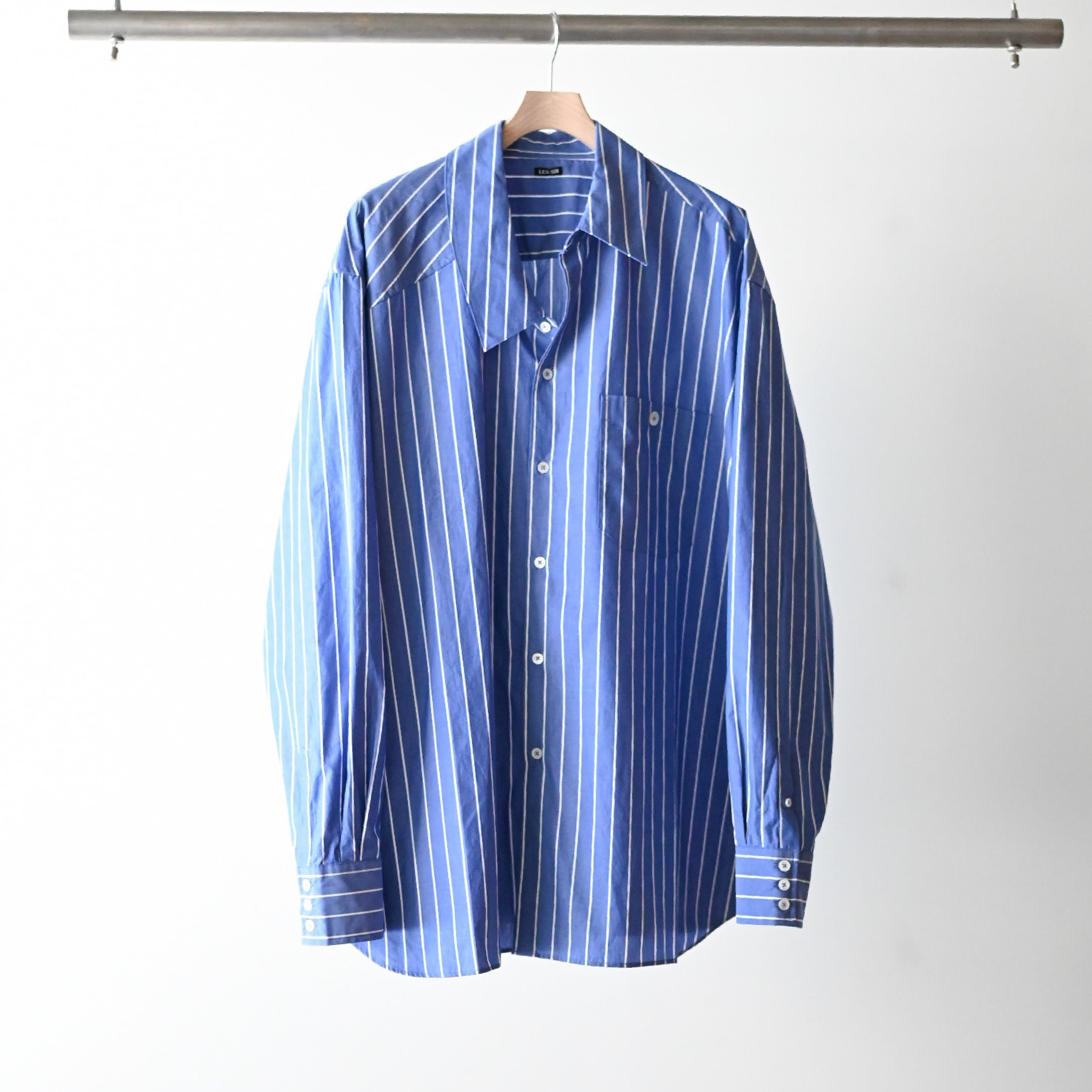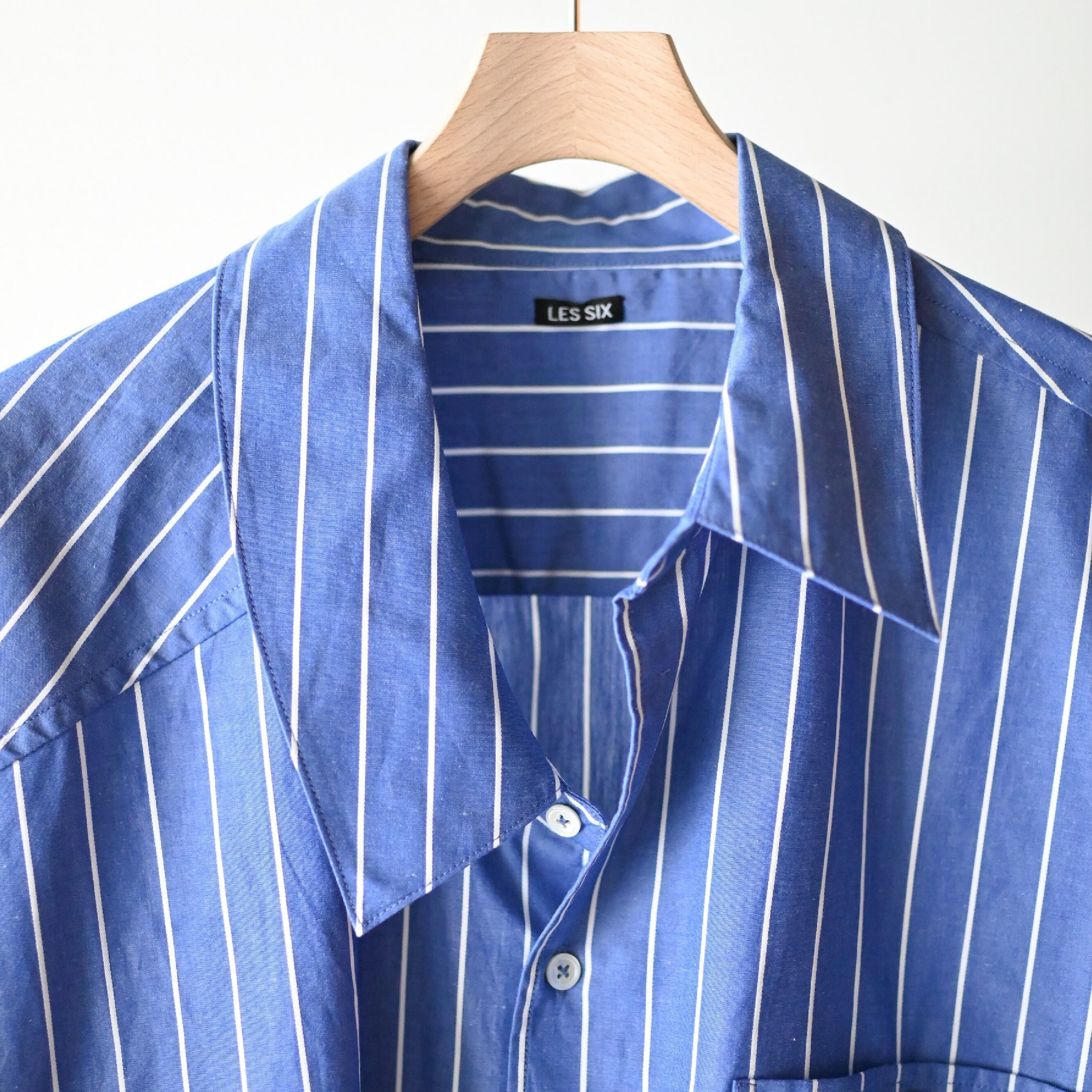 爽やかなストライプシャツをファショナブルなサイズ感に昇華させた1着。