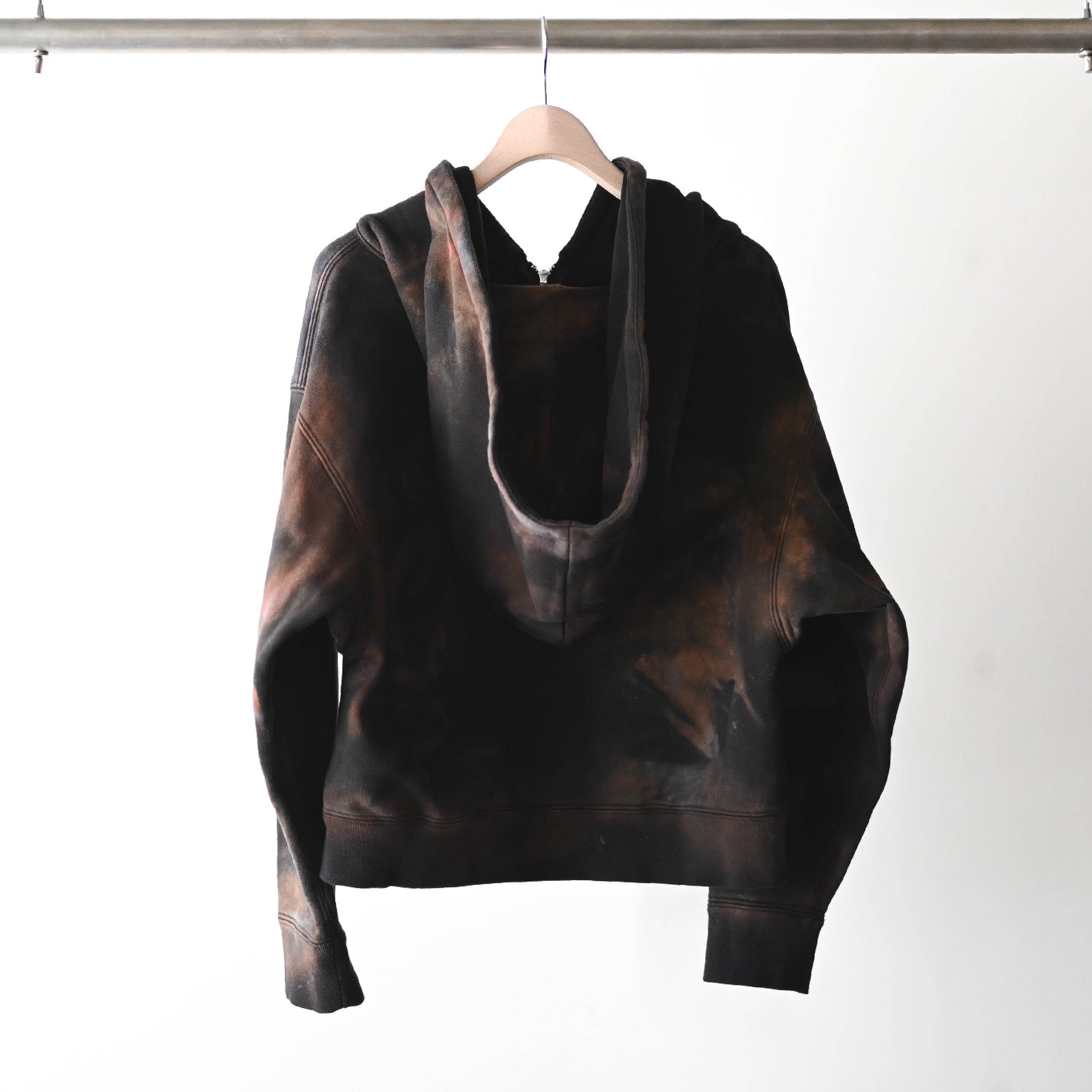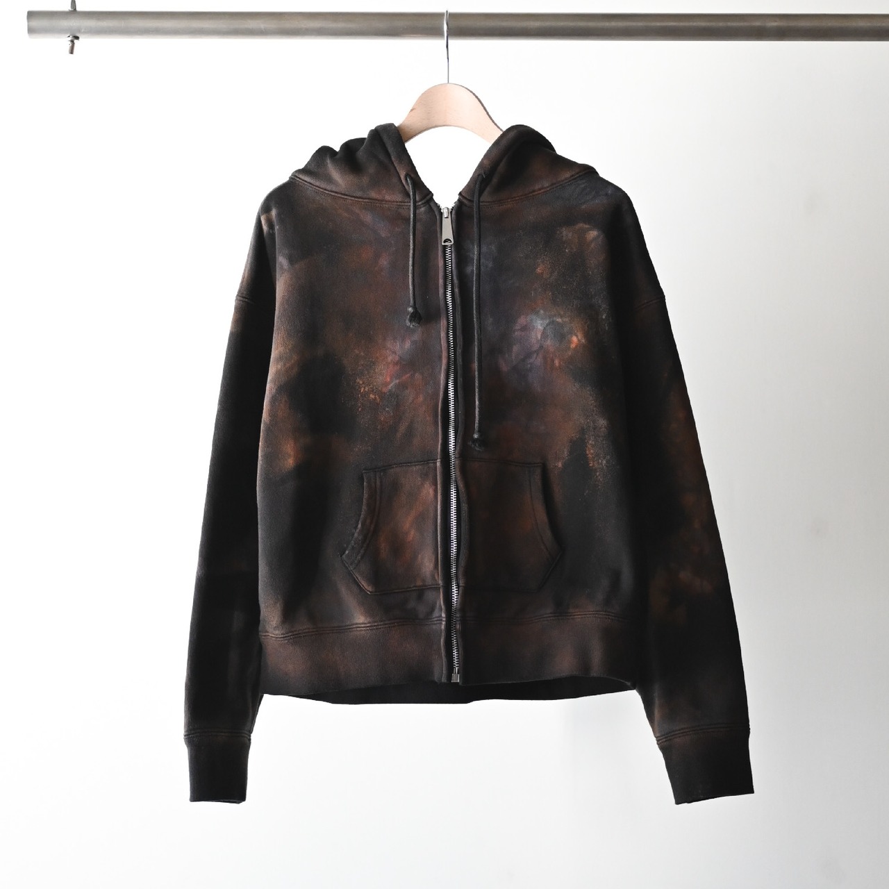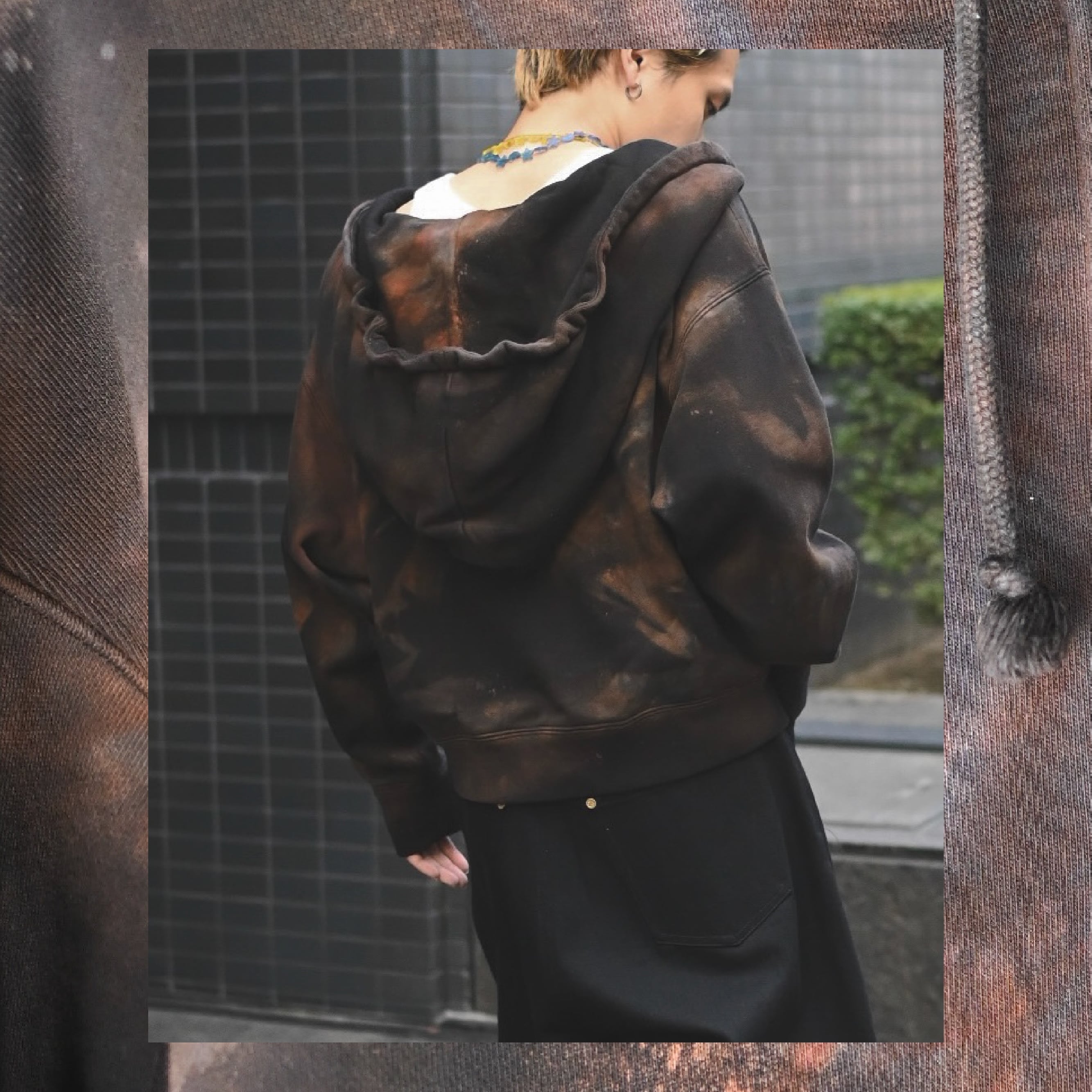 同ブランドらしい存在感のある生地の加工が目を惹くジップアップフーディー。