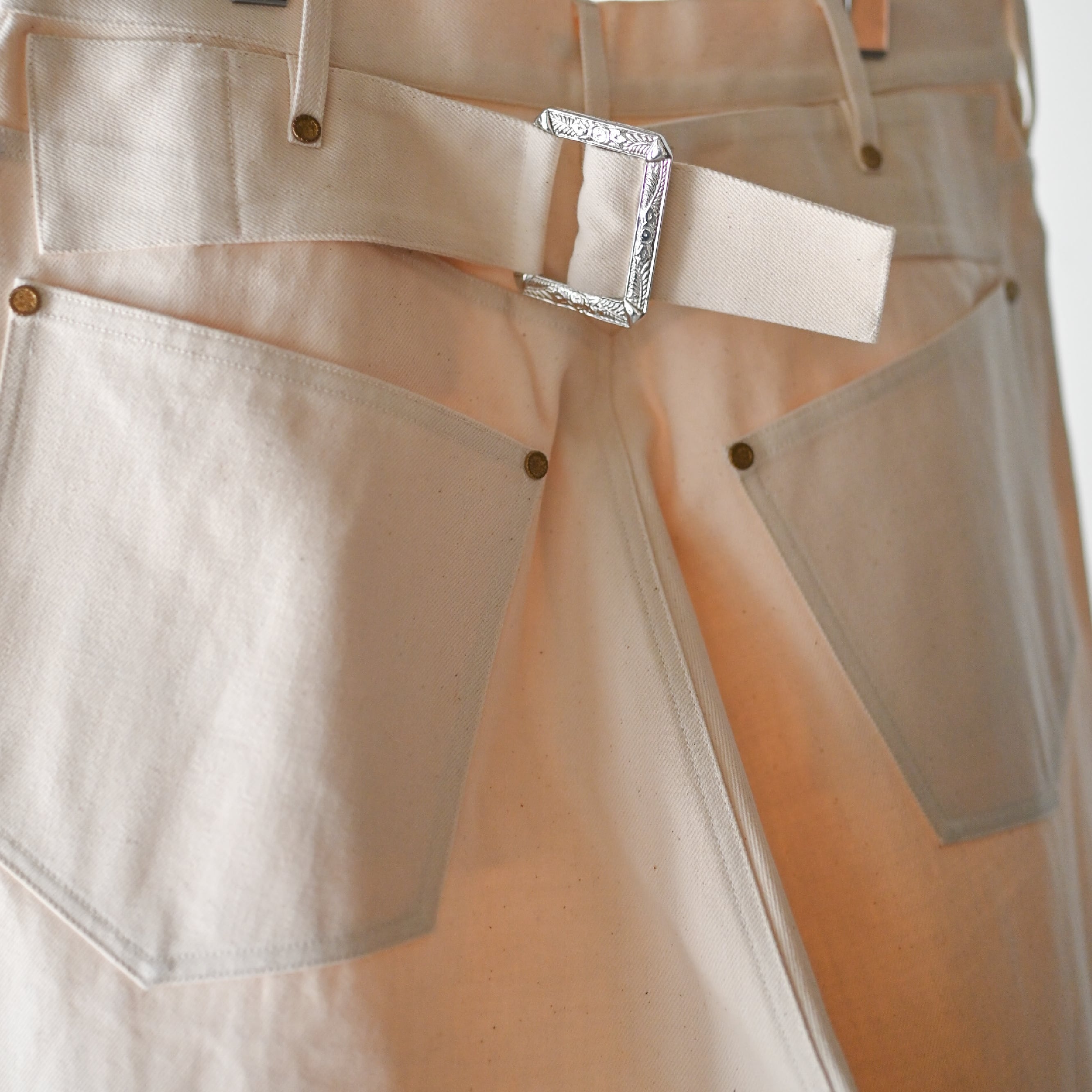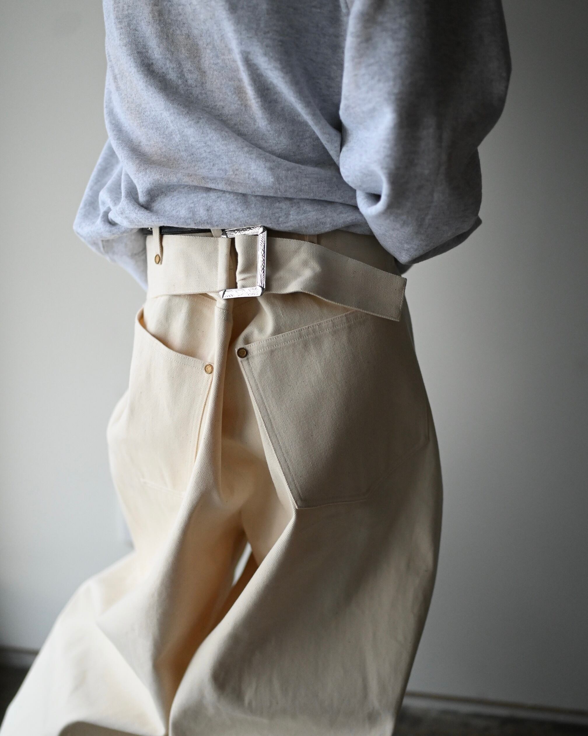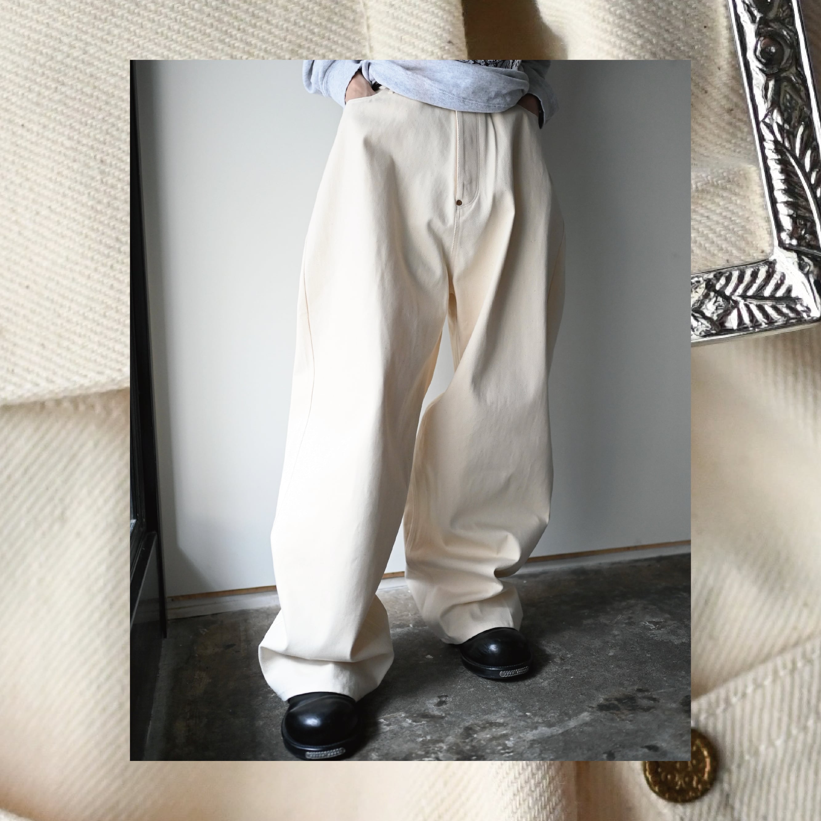 腰回りから裾にかけてズドンと落ちるワイドストレートなシルエットは同ブランドのアイテムは勿論、様々なアイテムに合わせやすくスタイリングの質をしっかりと上げてくれるベースアイテムとしておすすめ致します。