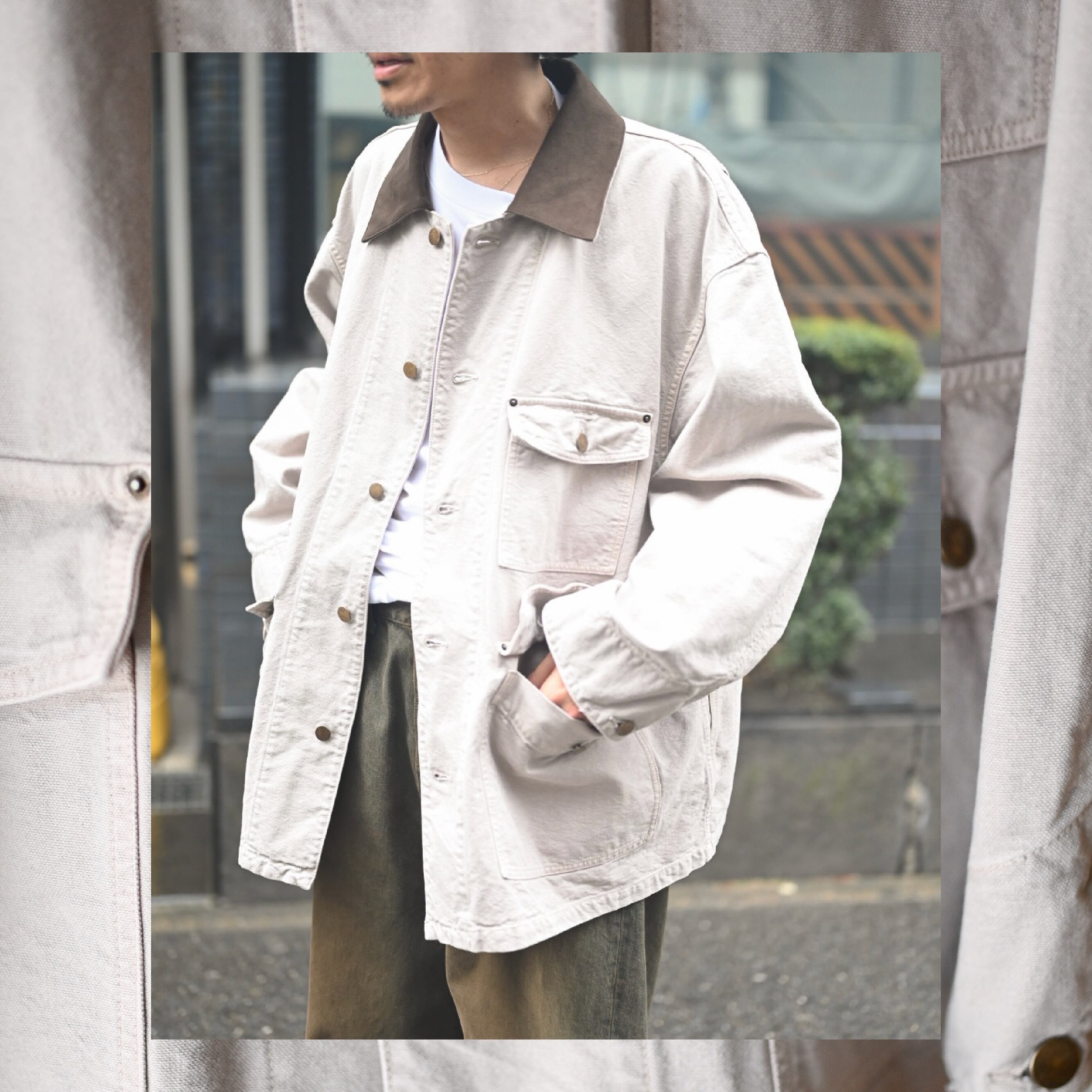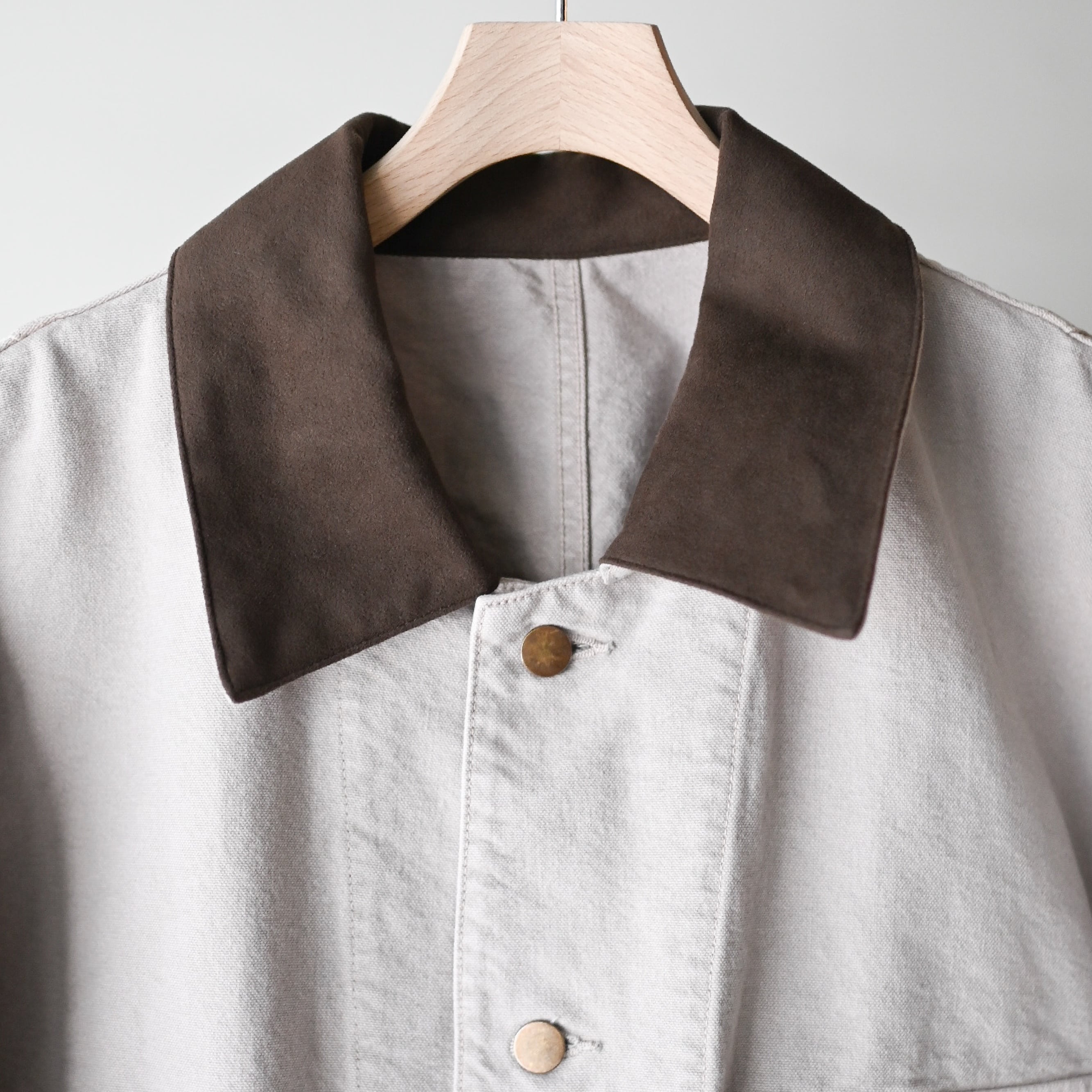 ゆったりオーバーなシルエット、全体のワークな雰囲気に表襟にはウルトラスエードを採用した「上品さ」のアクセントも加わったアイテム。同ブランドらしいアクションプリーツと立体的なアームはインナーを着込んだ際にも身体に沿う快適な着心地で、春先までガシガシ着ていただきたい逸品です。