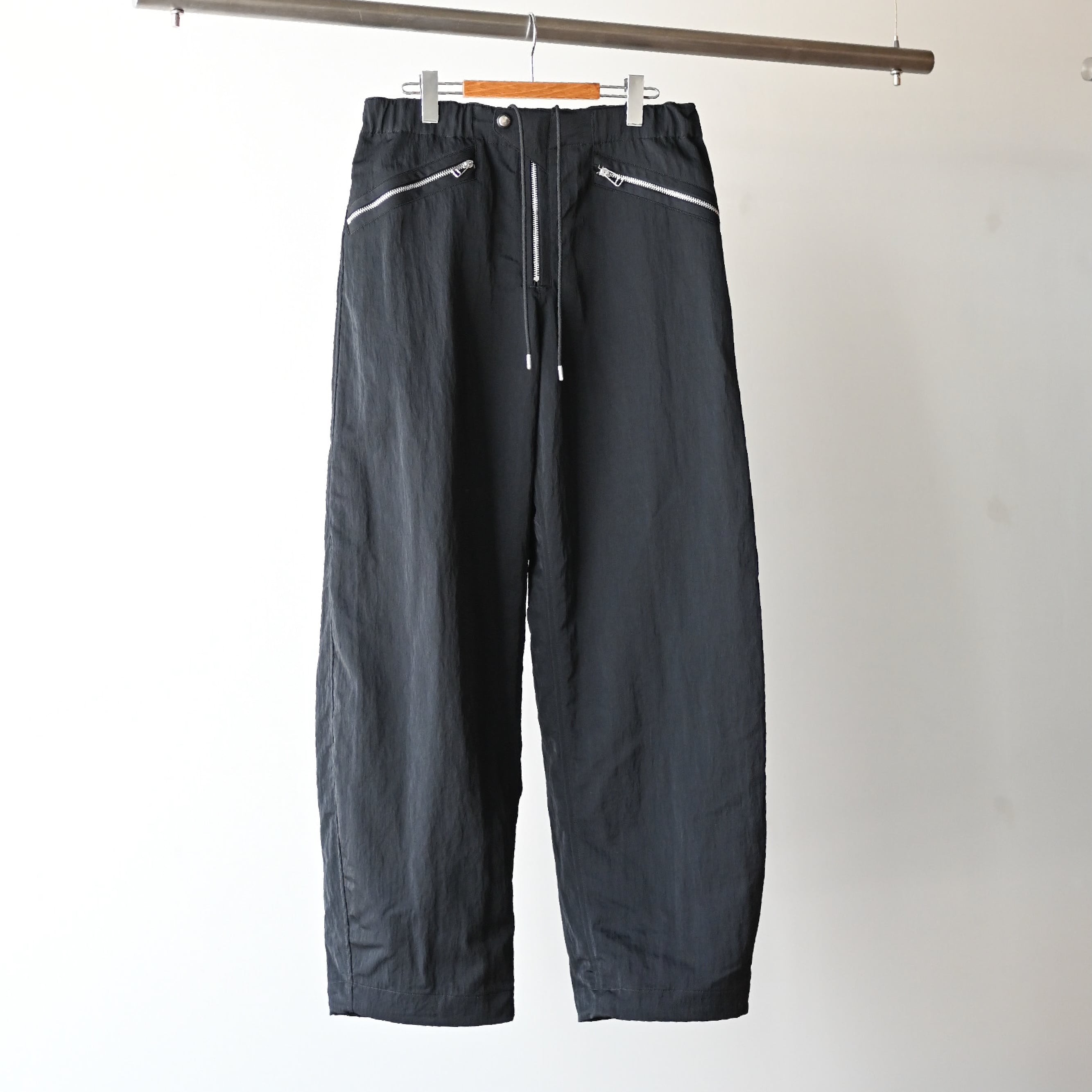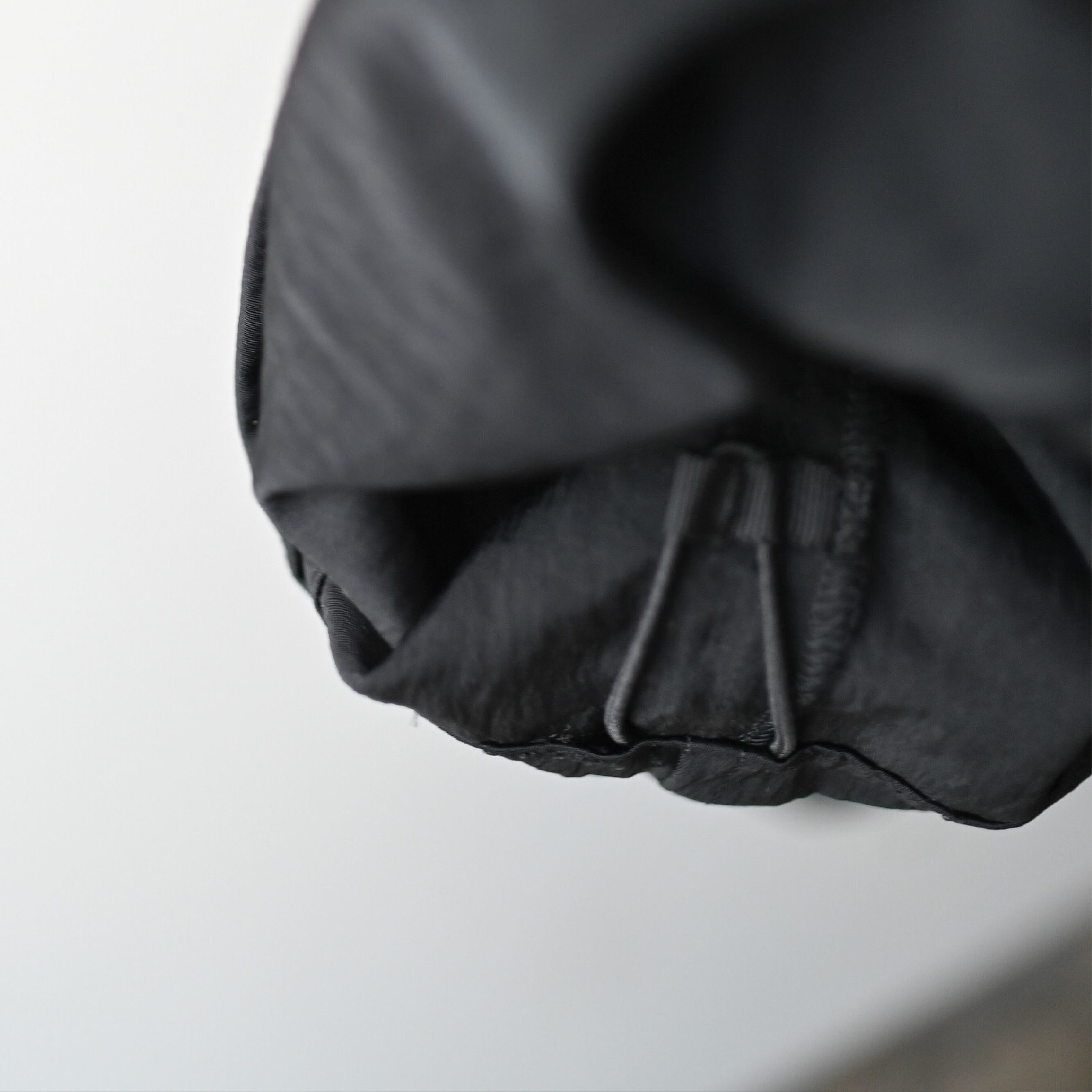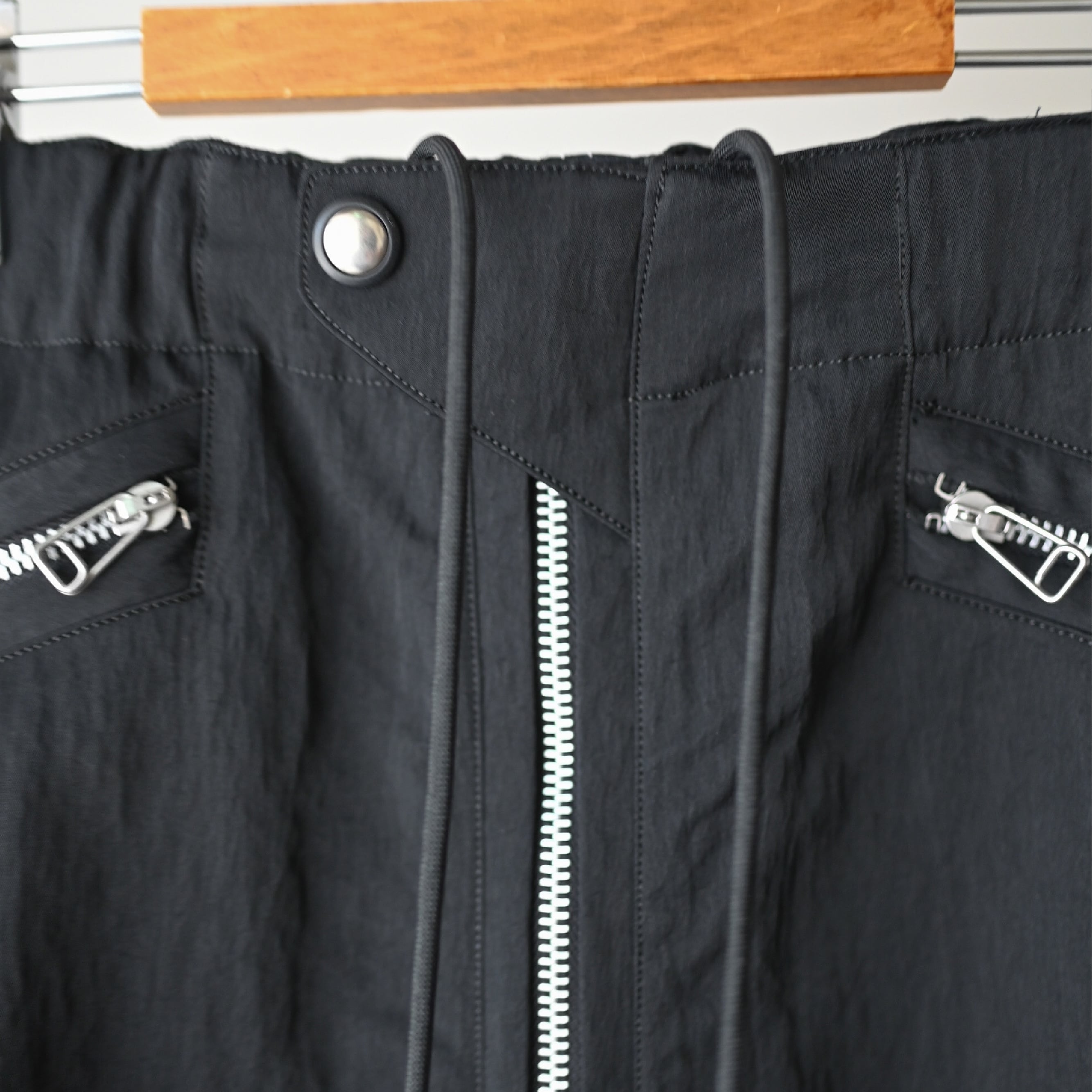 ウエストゴム&ドローコードにフロントはジップとスナップボタン仕様、ジップ付きのサイドポケットなどフロントデザインが特徴的な一本。裾にはスピンドルが備え付けられているので絞ることで引きずる事なくスポーティーな雰囲気にまとまります。