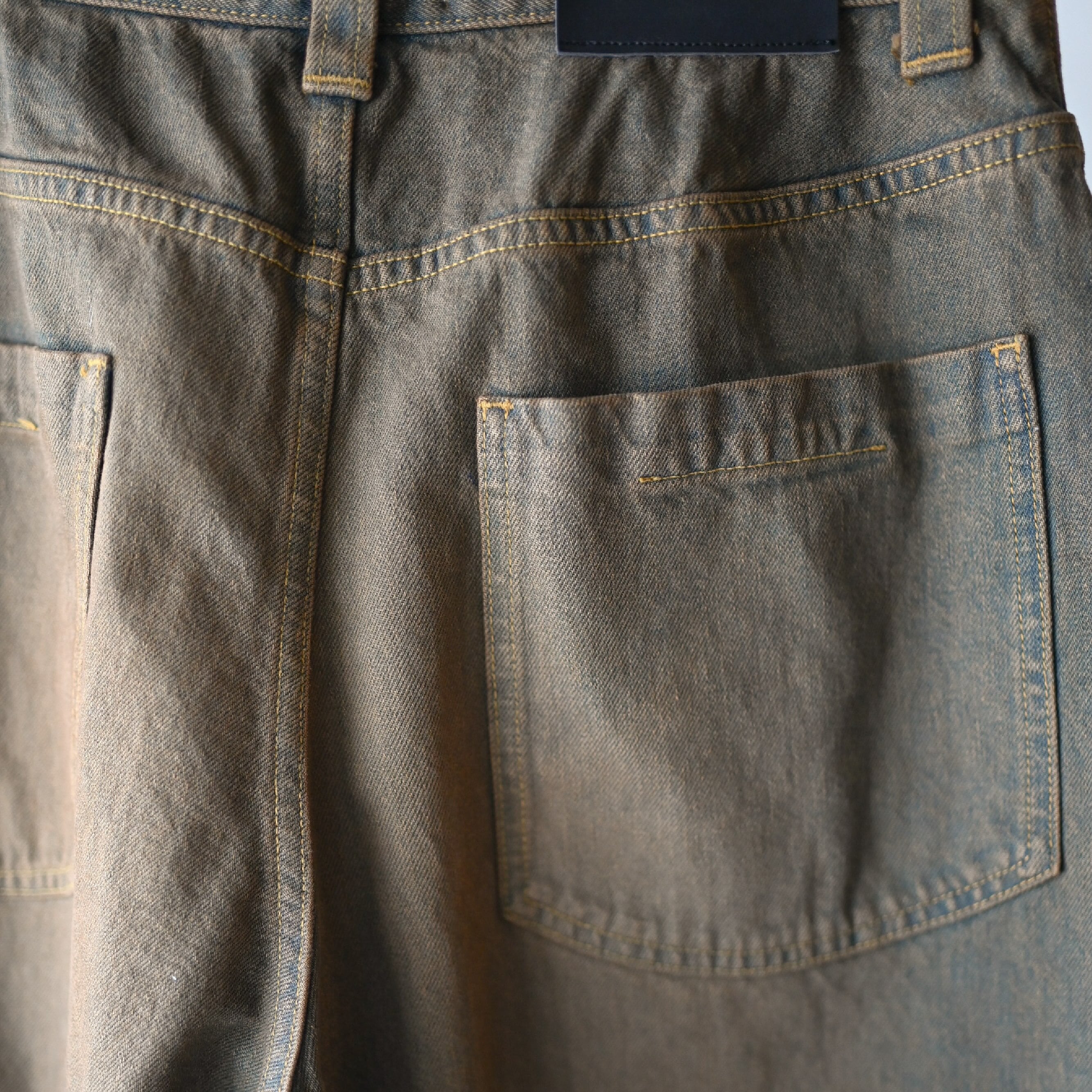 全体の色落ちやボタン・リベットの錆加工からは古着らしさも感じつつ、内股にはマチが付く事によって裾へかけての綺麗なシルエットを形成します。