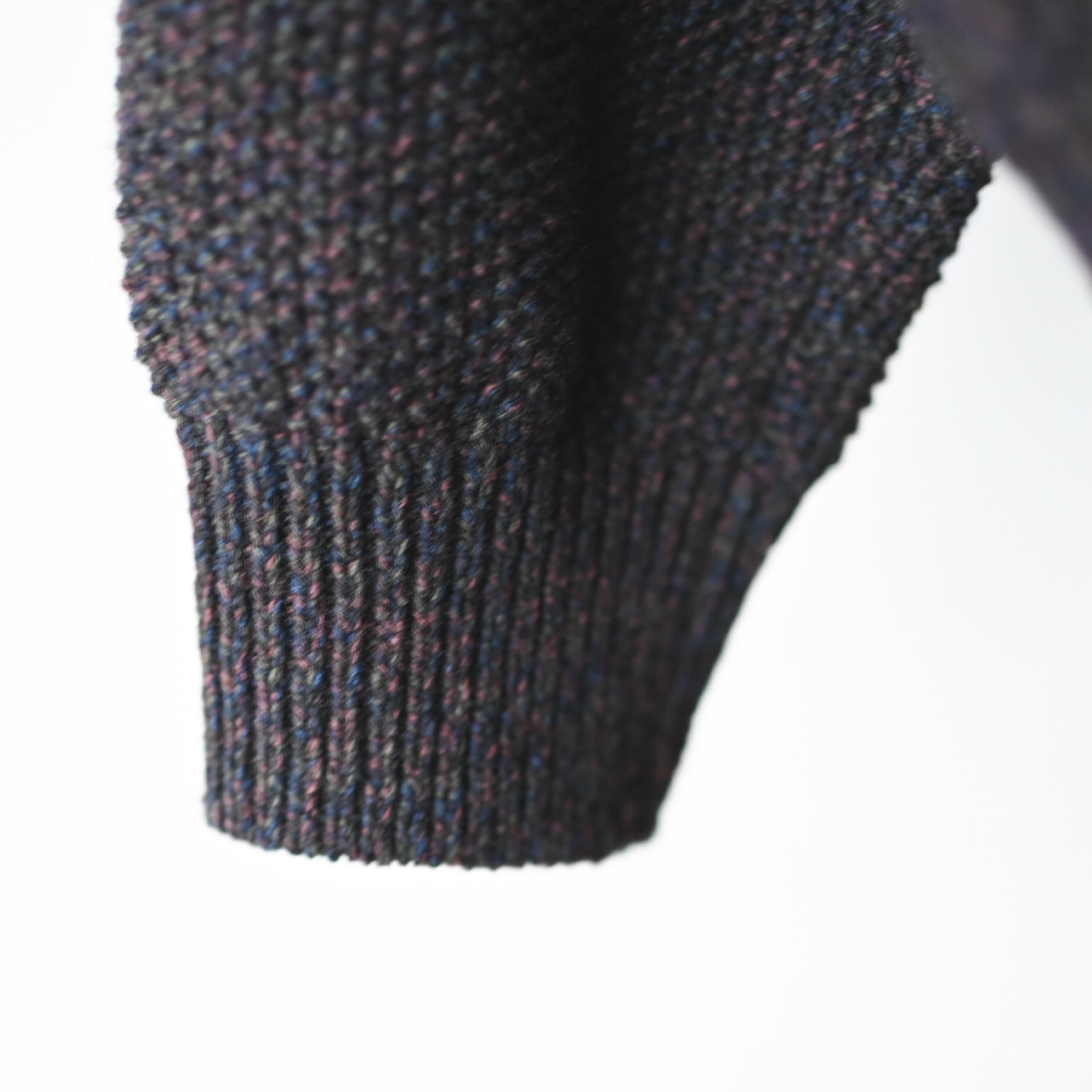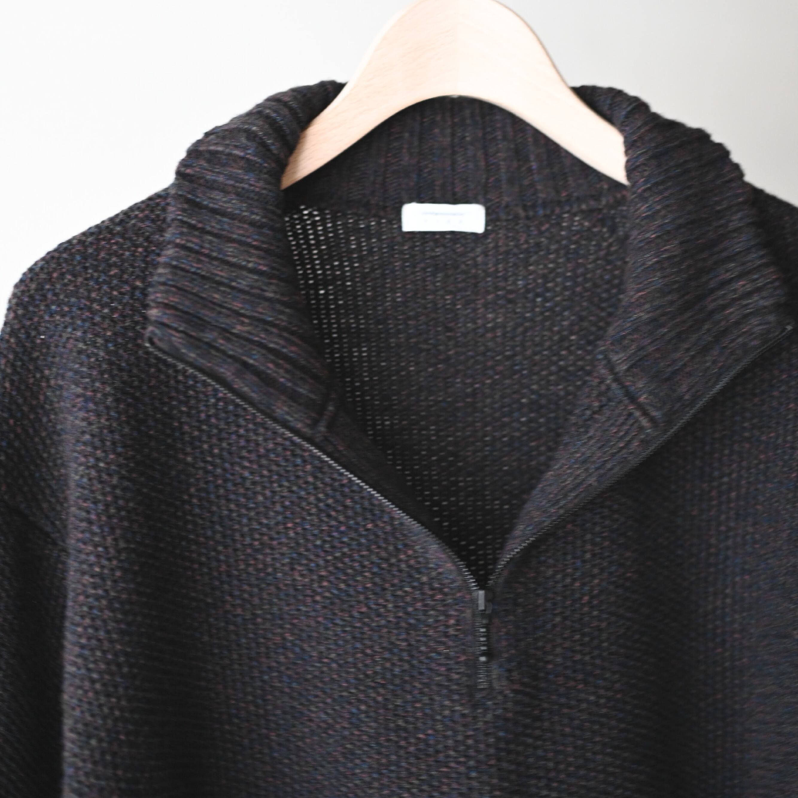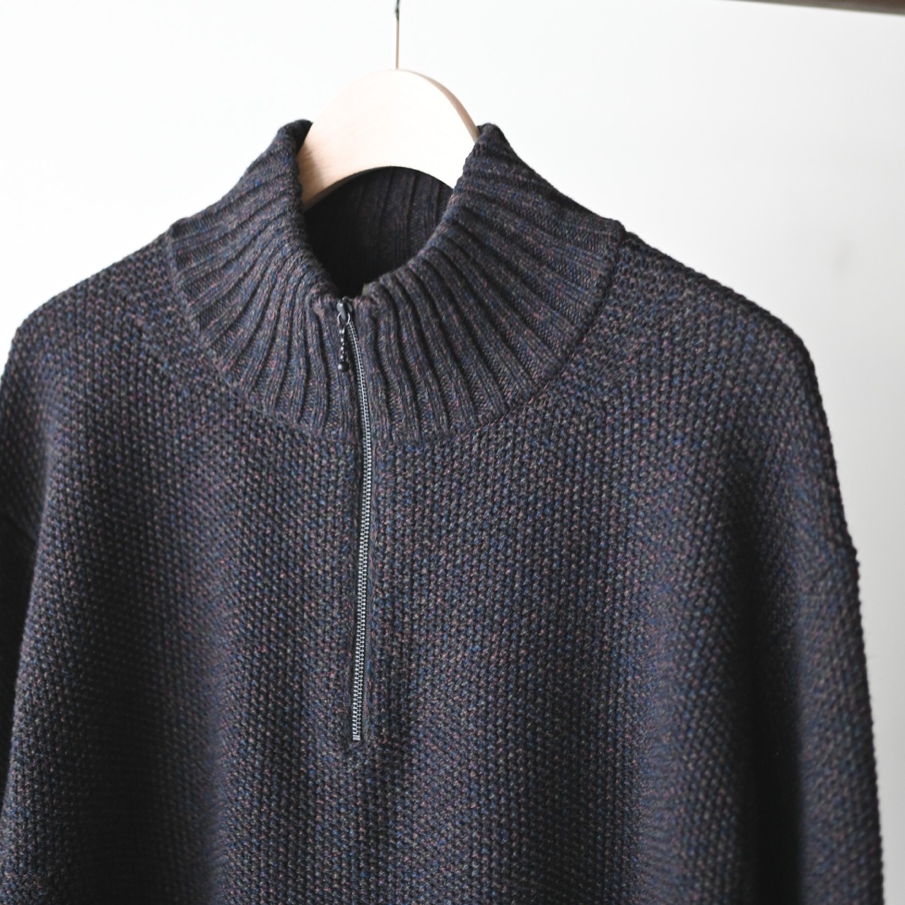 落ち着いたカラーリングをベースに多色ウール使いによって、グラデーションな奥行きのある色目とアウターライクな肉厚感を備えたハーフジップニット。