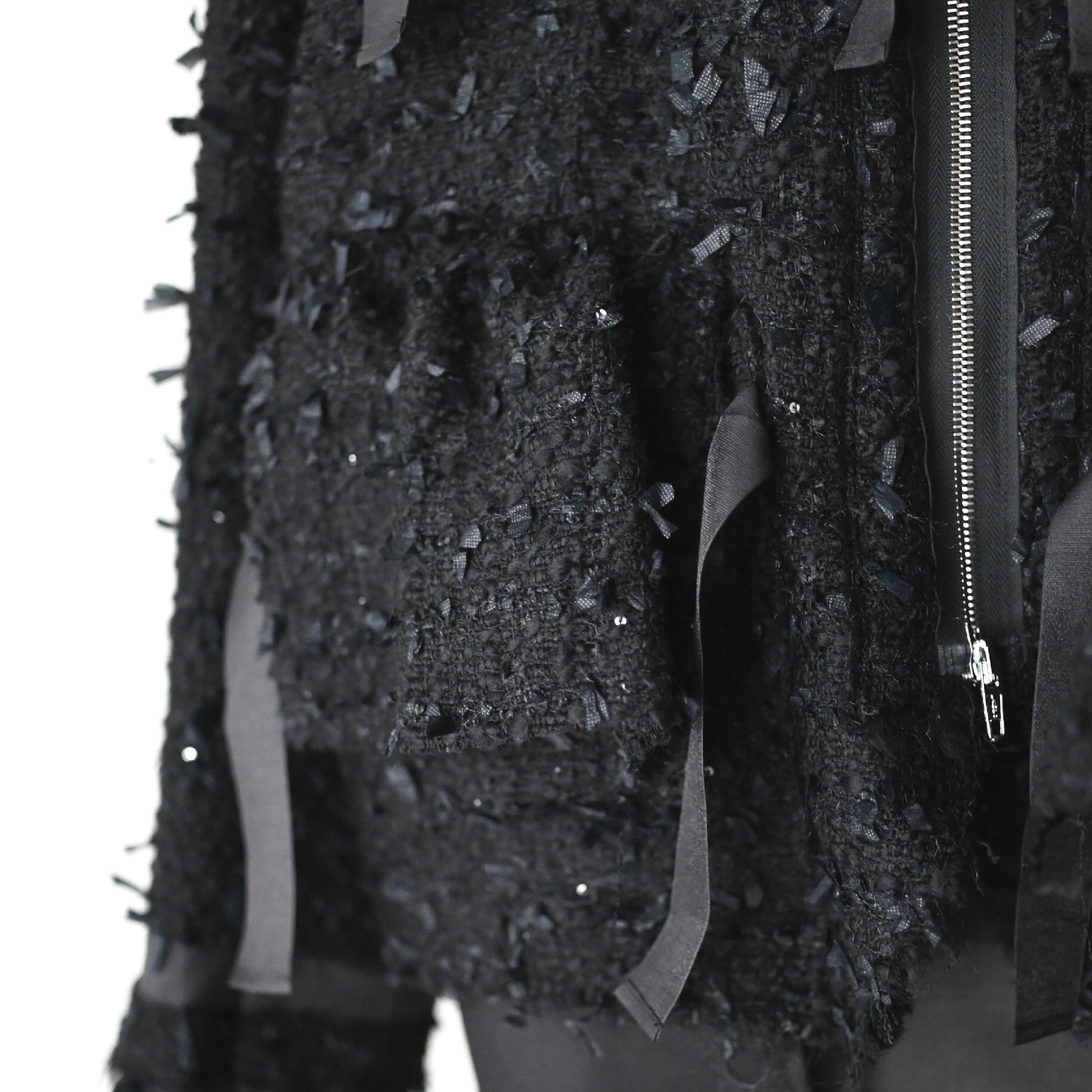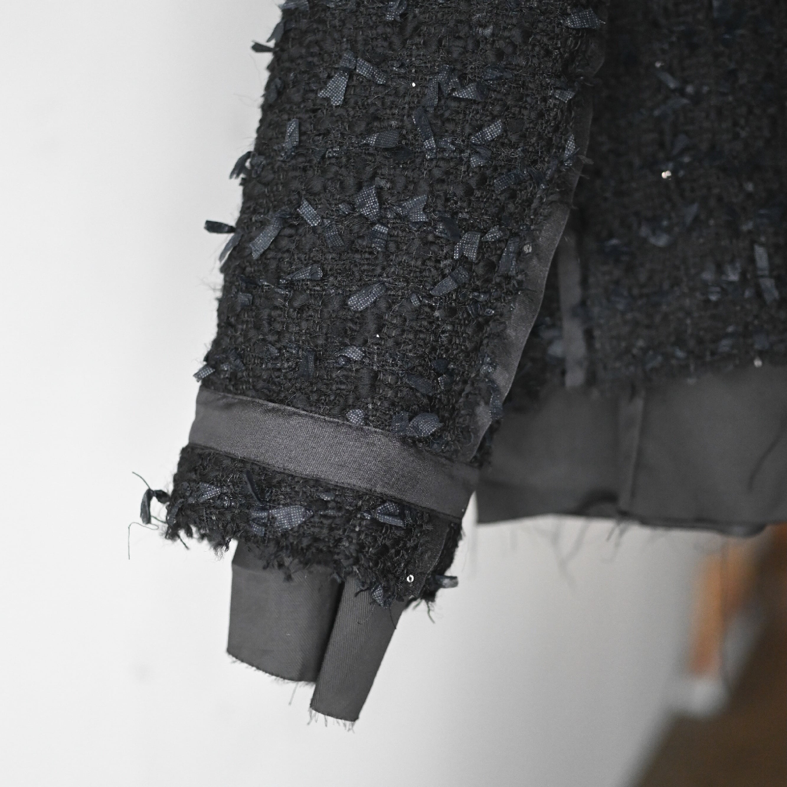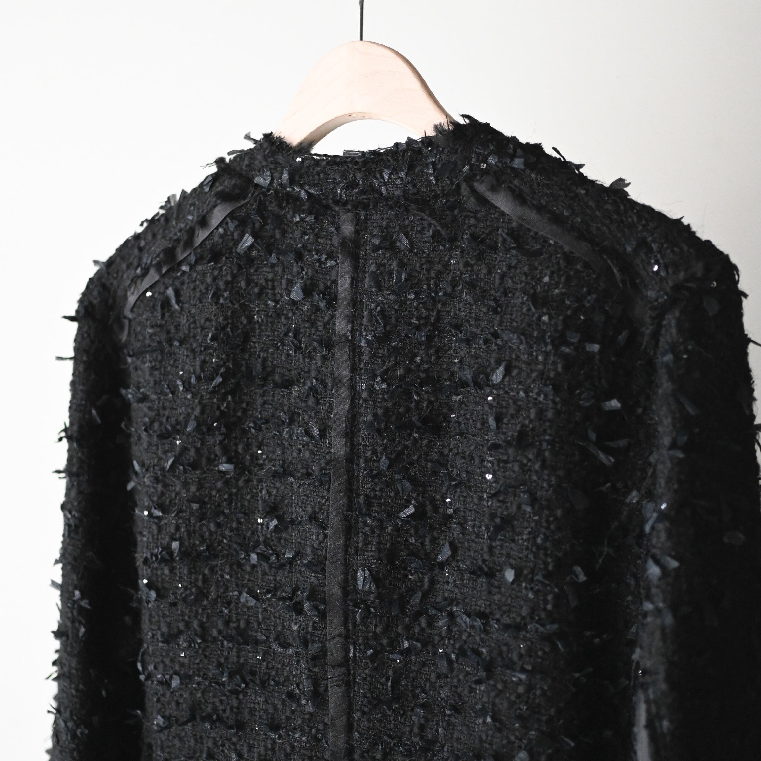 8種類の糸を用いたオリジナルファンシーツイード素材にリボンテープ、スパンコールを散りばめた、実に〈Midorikawa〉らしい華やかなツイードジャケット。
