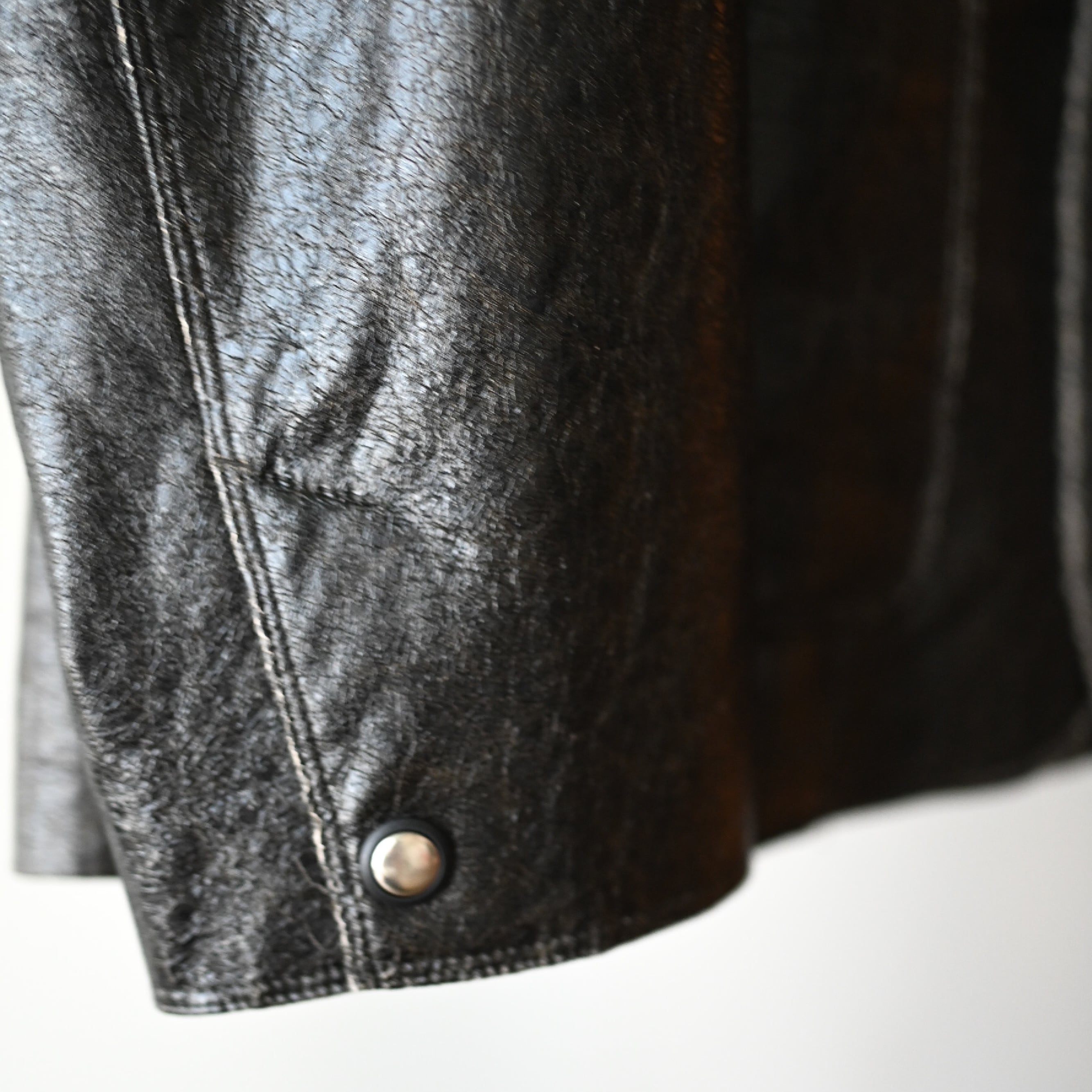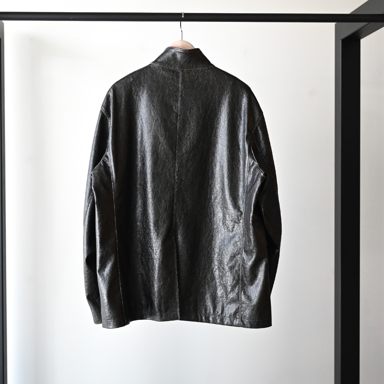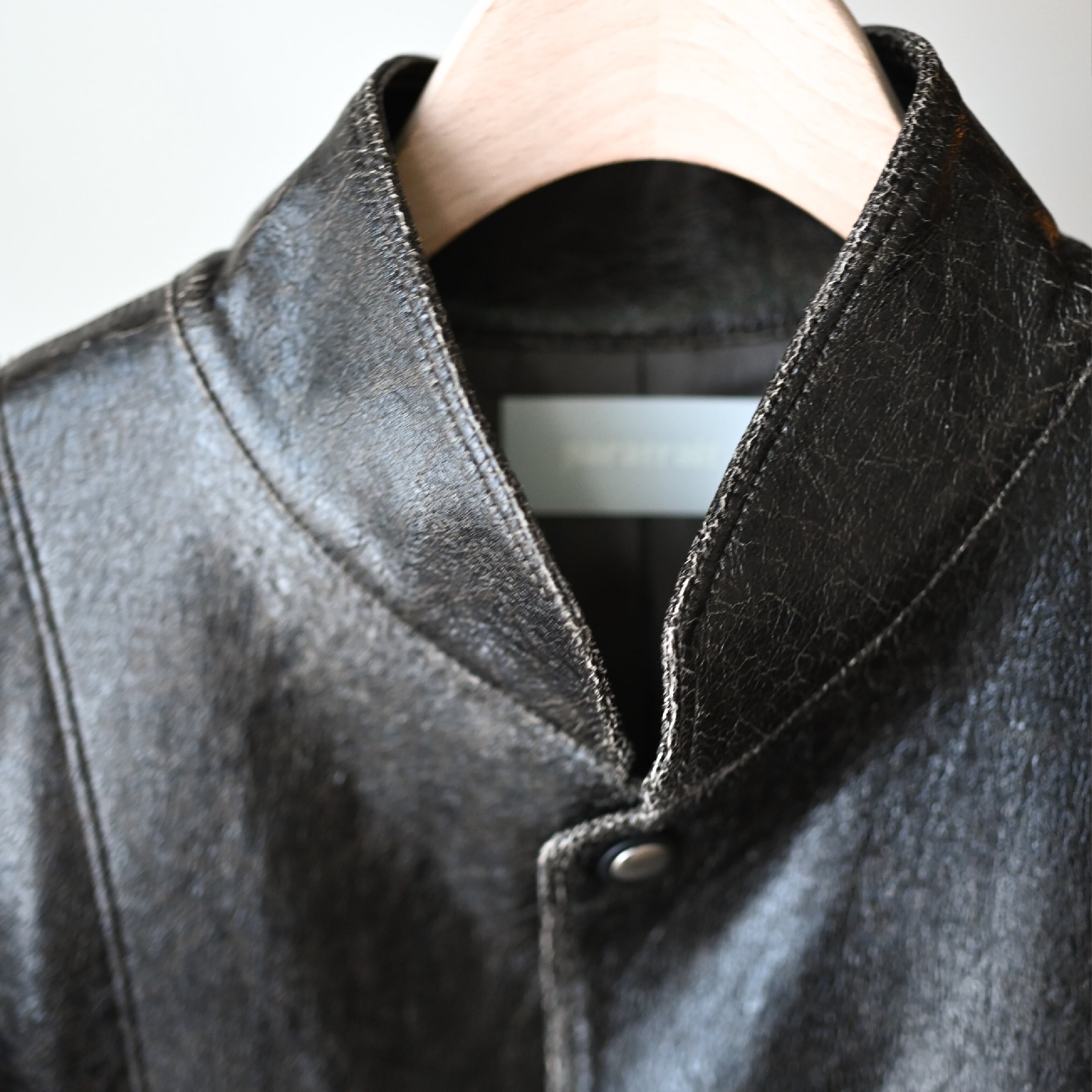 ハードにクラックしたレザーのような加工を施した生地で仕立てたハーフカラージャケットになります。