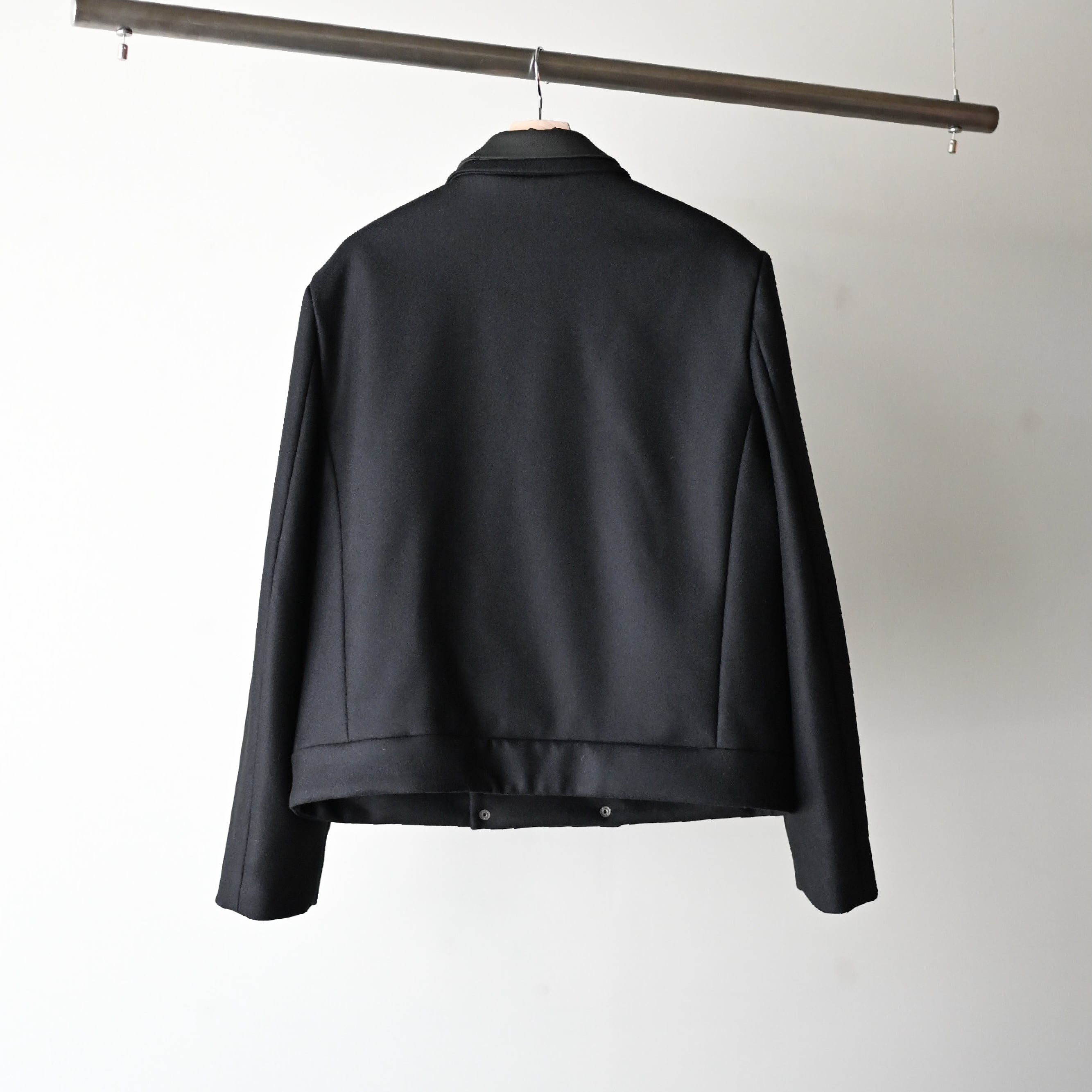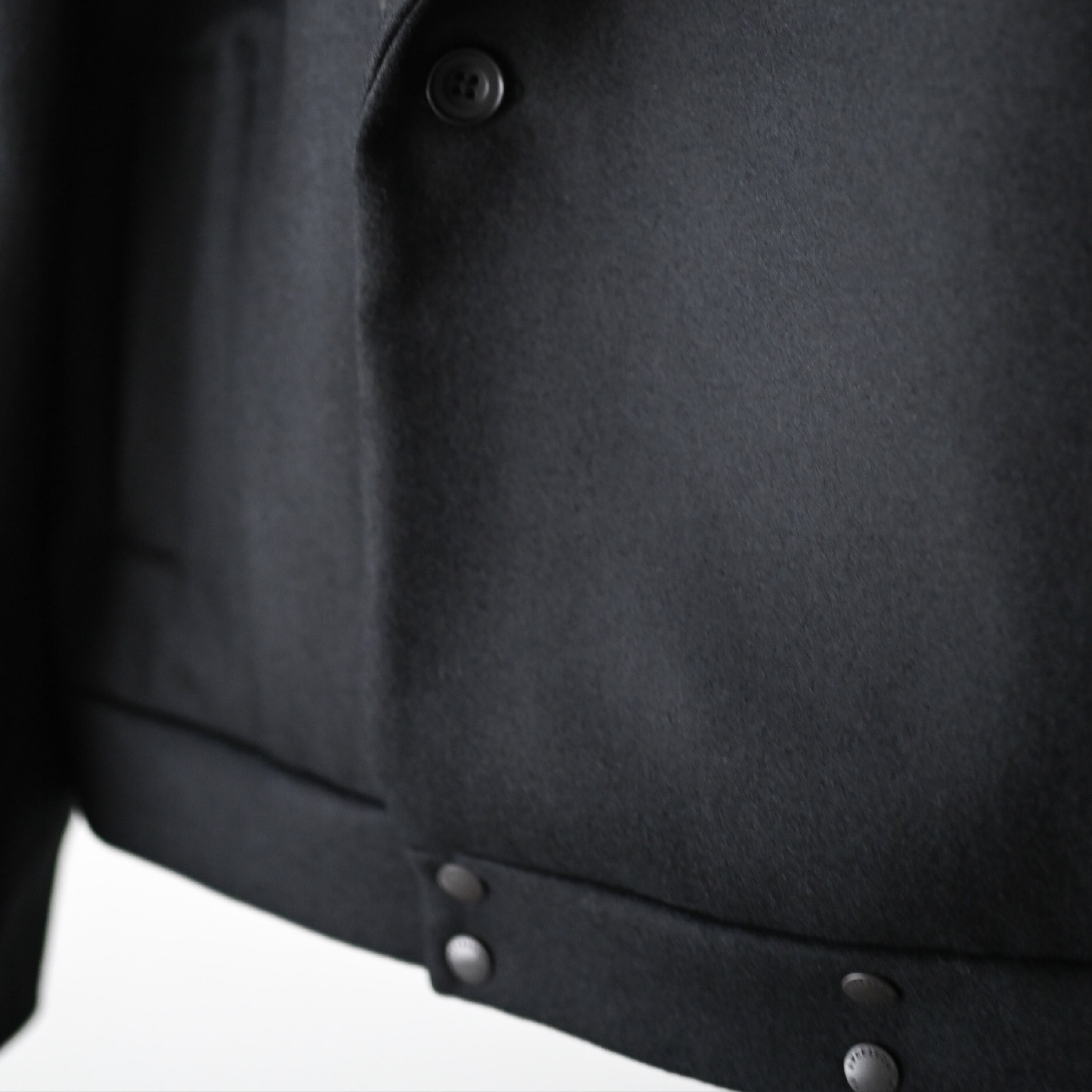 表側は通常よりも細く繊細な繊維を使用した薄手のメルトン素材、内側の襟は織り上げた後に樹脂加工を施し、ハリ感をより出した最高級ウール素材を使用しています。
