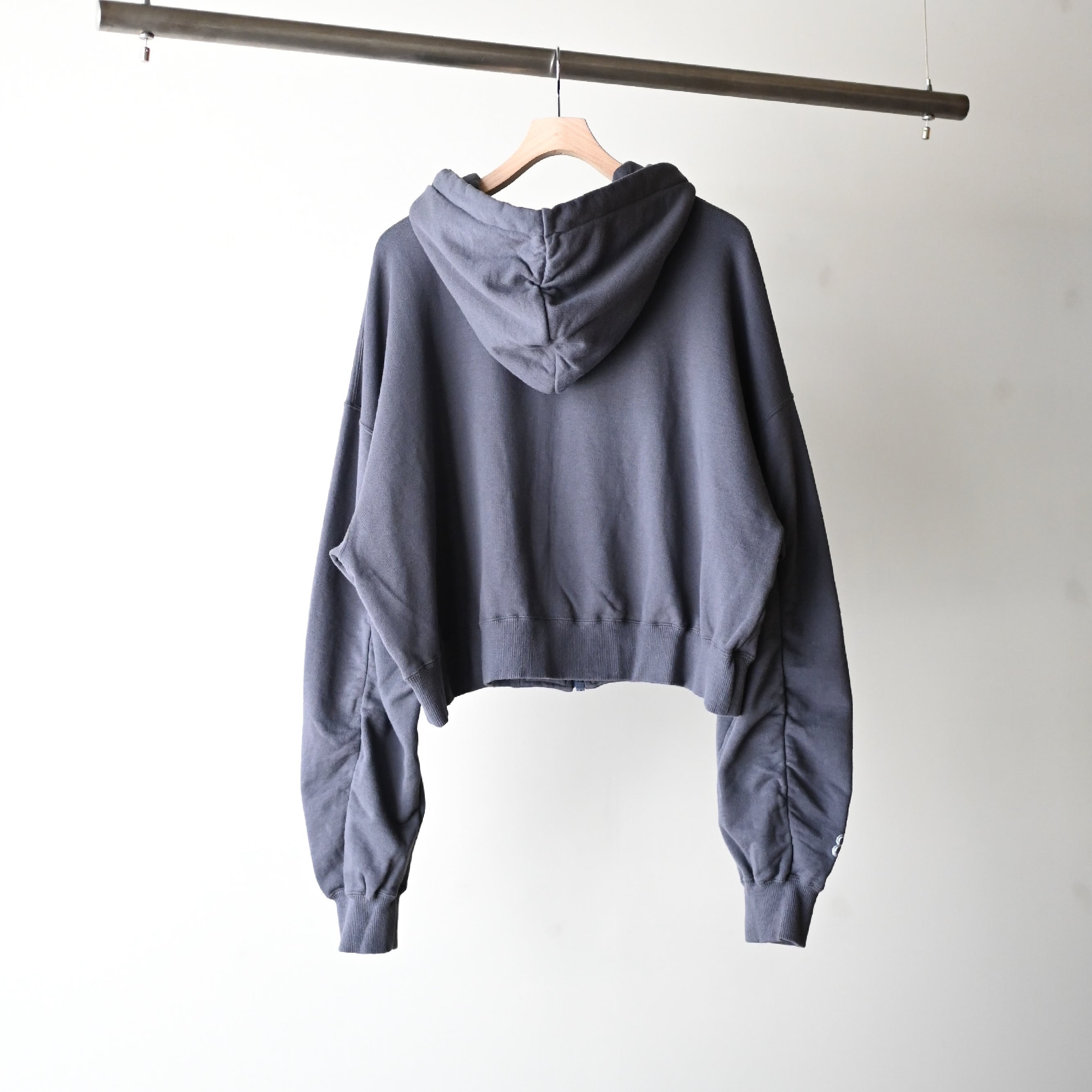 25SSから継続のショート丈フーディです。握手した時に見えるように右袖にクローバーの刺繍が入っております。