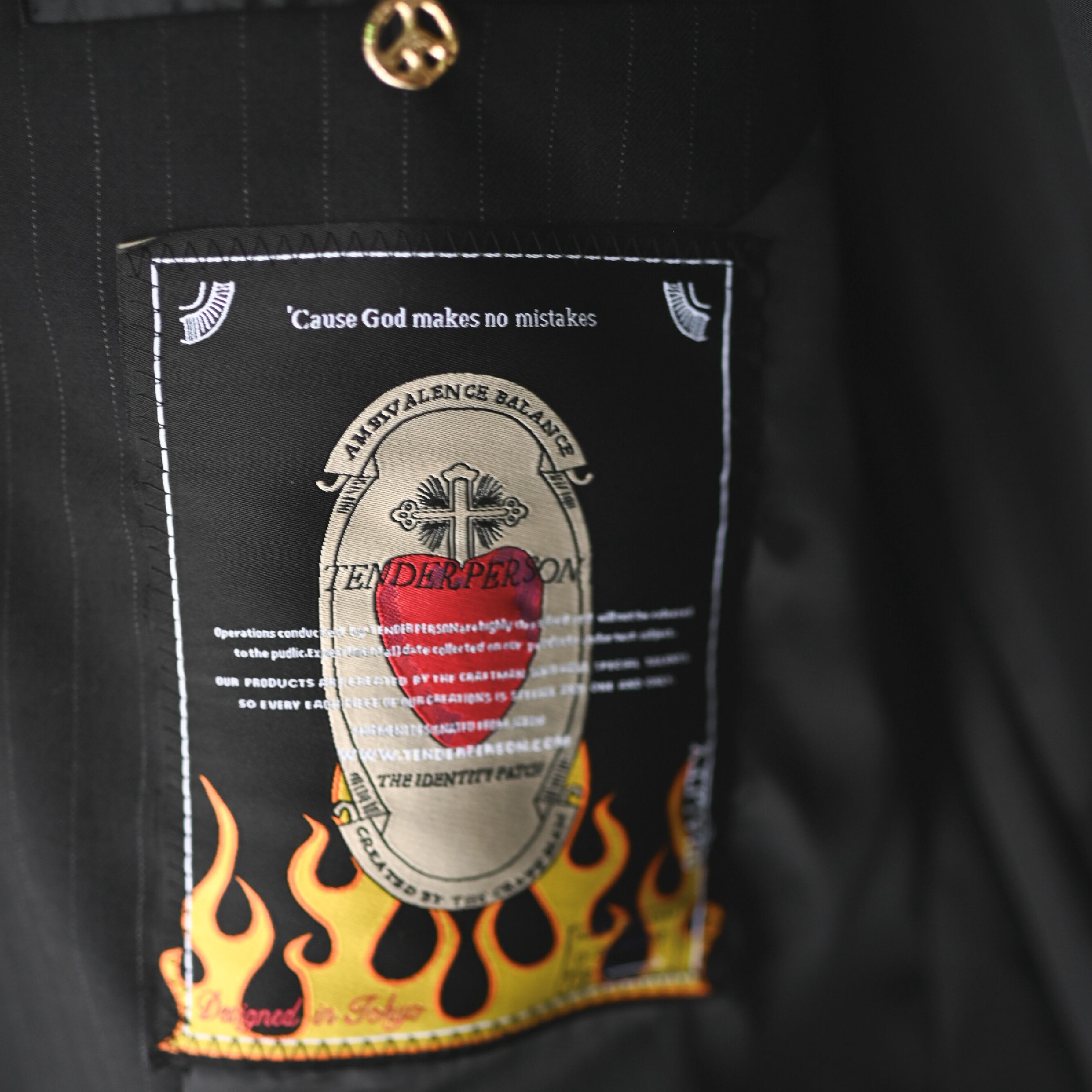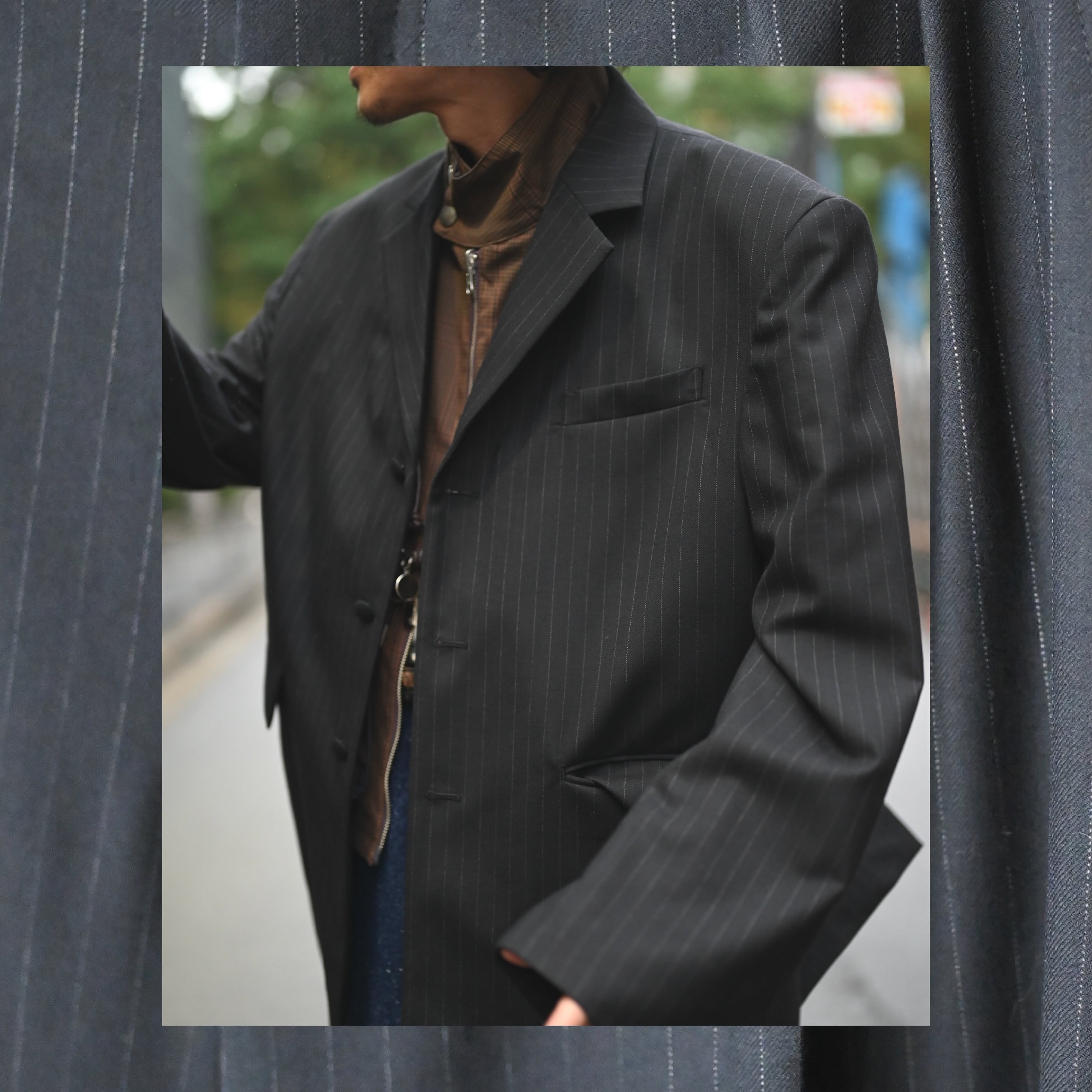 セットアップで作ったジャケットはデザイナーの祖父の木製タンスに綺麗に並べられ、綺麗な石が埋め込まれたネクタイピン、カフスボタン、ゴールドアクセサリー、ヘアトニックとポマードの匂い。そんな匂い、空気、残像がアイデンティティーとなったルーツのようなものを感じて頂ける1着に仕上がっています。