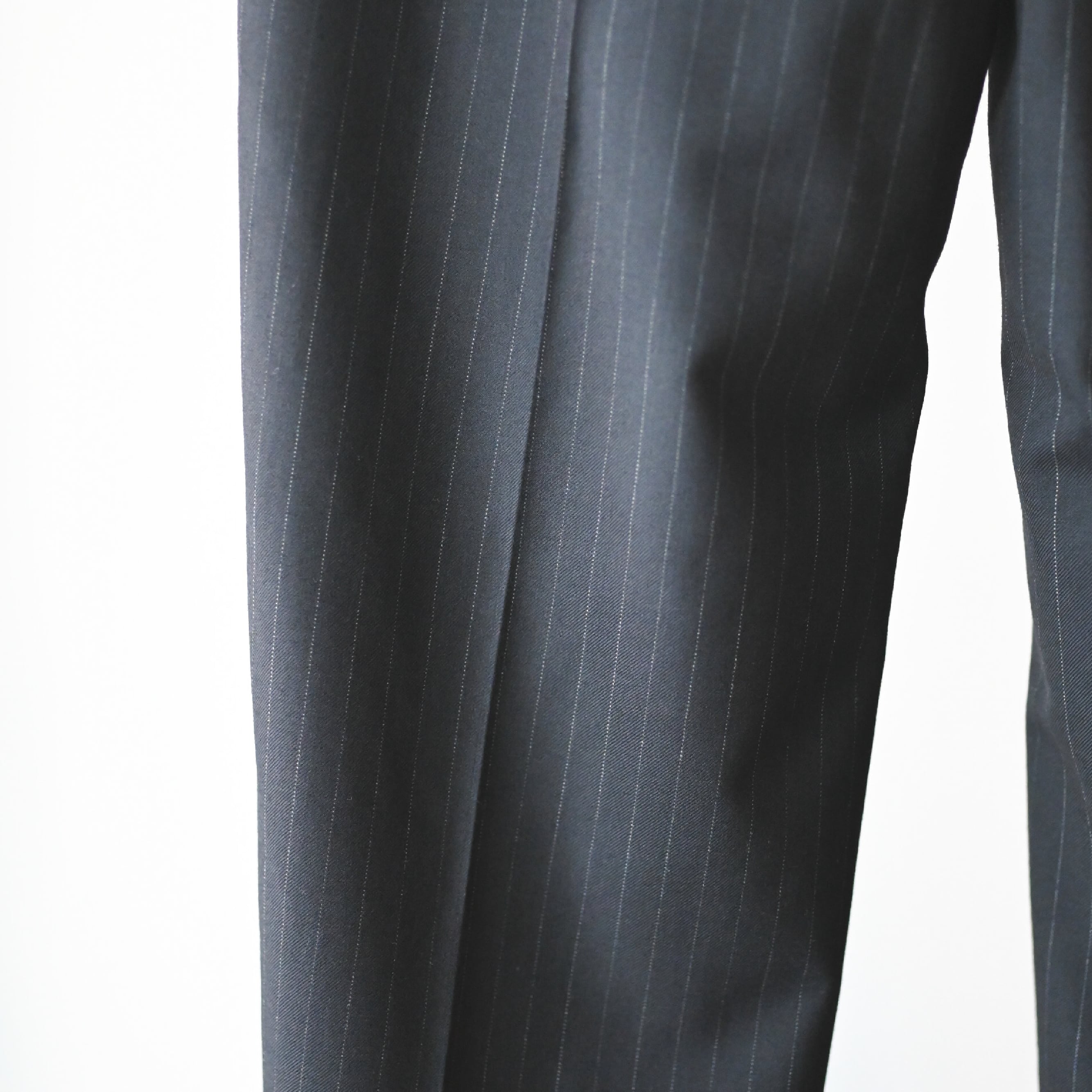 尾州産のSuper'100ウールストライプを使用し丁寧に仕立てられた2タックのスラックスパンツ。