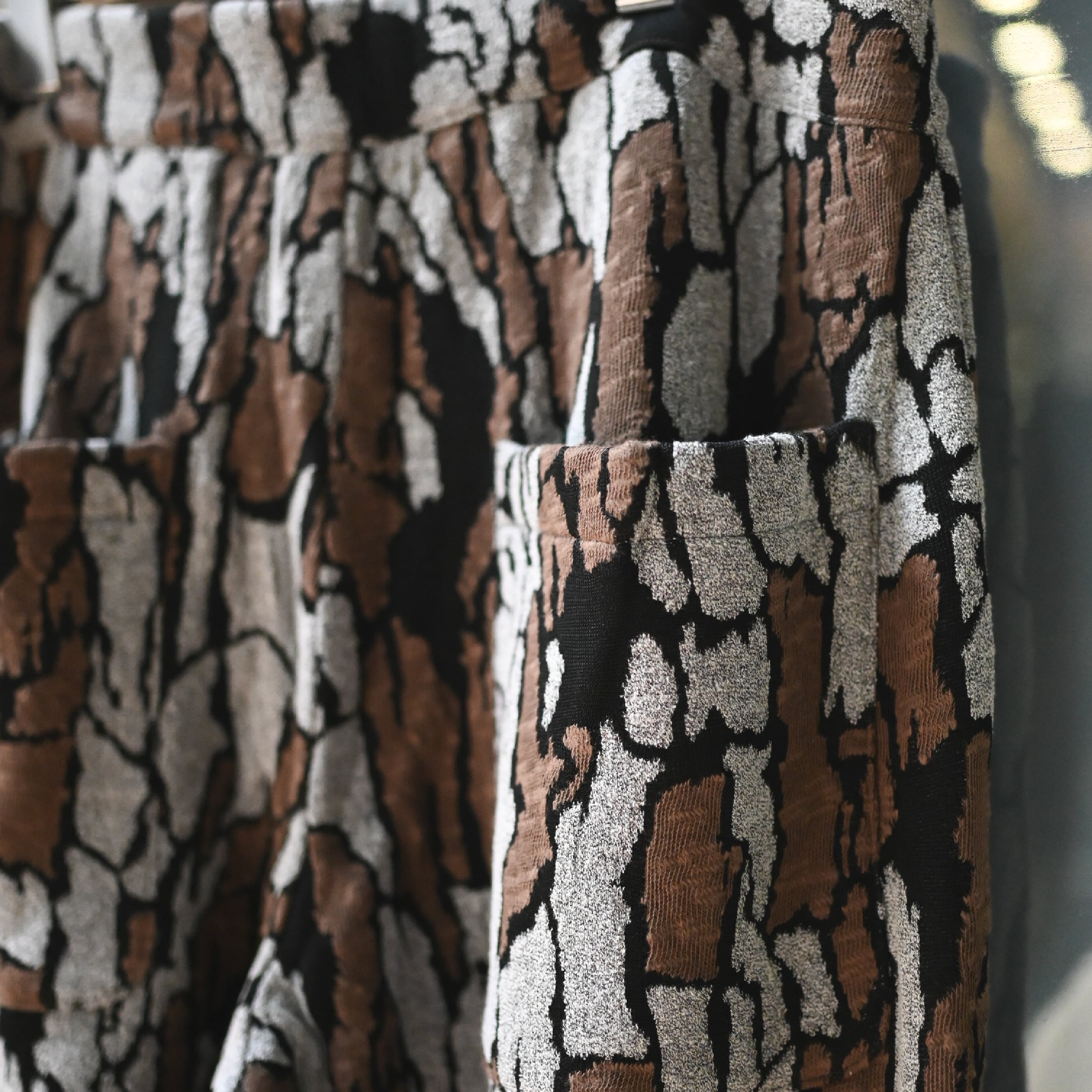 枯れた樹脂の風合いをイメージした独特のカモフラージュ柄は、凸凹感のあるスラブコットン、ブークレコットン、光沢感のあるキュプラ糸を袋ジャガード組織で編み立てることで、布帛やカットソーでは表現しきれない、奥行きのある立体的な編み地が作成できた。まるで柄が浮き出るかのような3Dテクスチャーが特徴。また袋ジャガードが中空組織のため非常に軽量。ウエストと裾はドローコードで絞れるように調整可能。