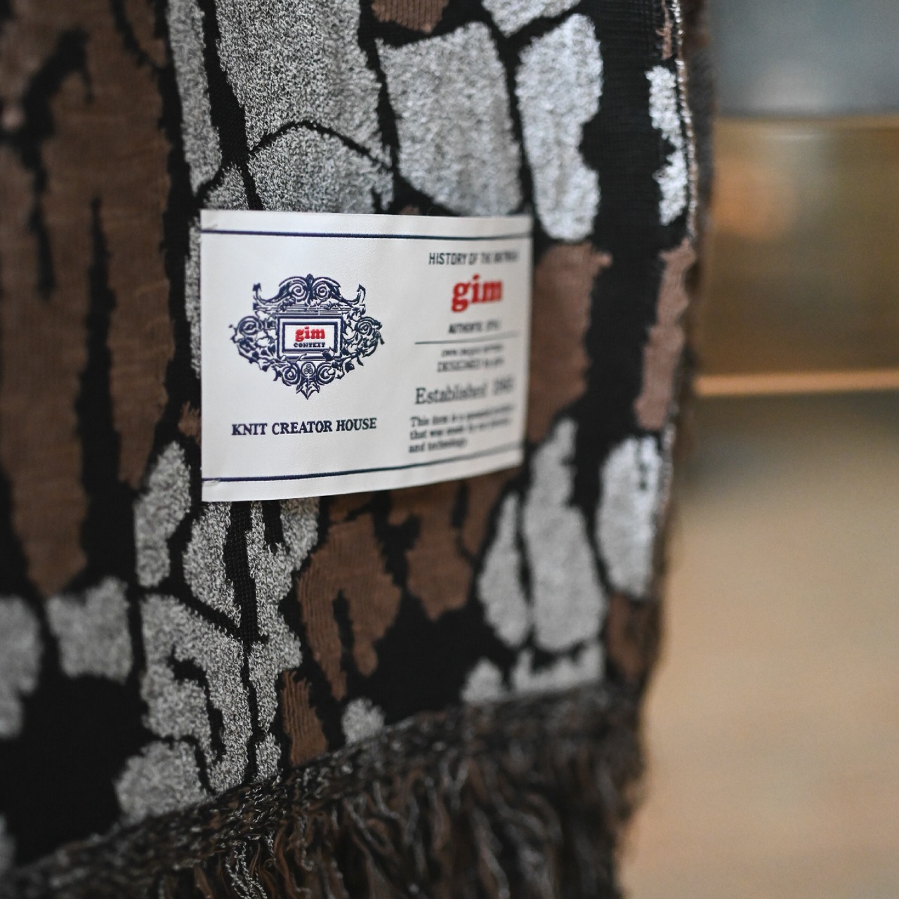 ハンティングジャケットのカモフラージュ柄をモチーフにした「トレバークカモ柄」の大判ニットマフラー。