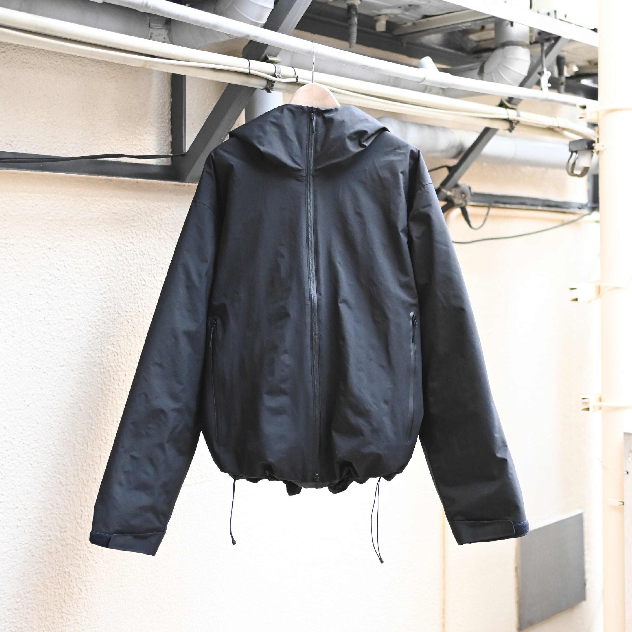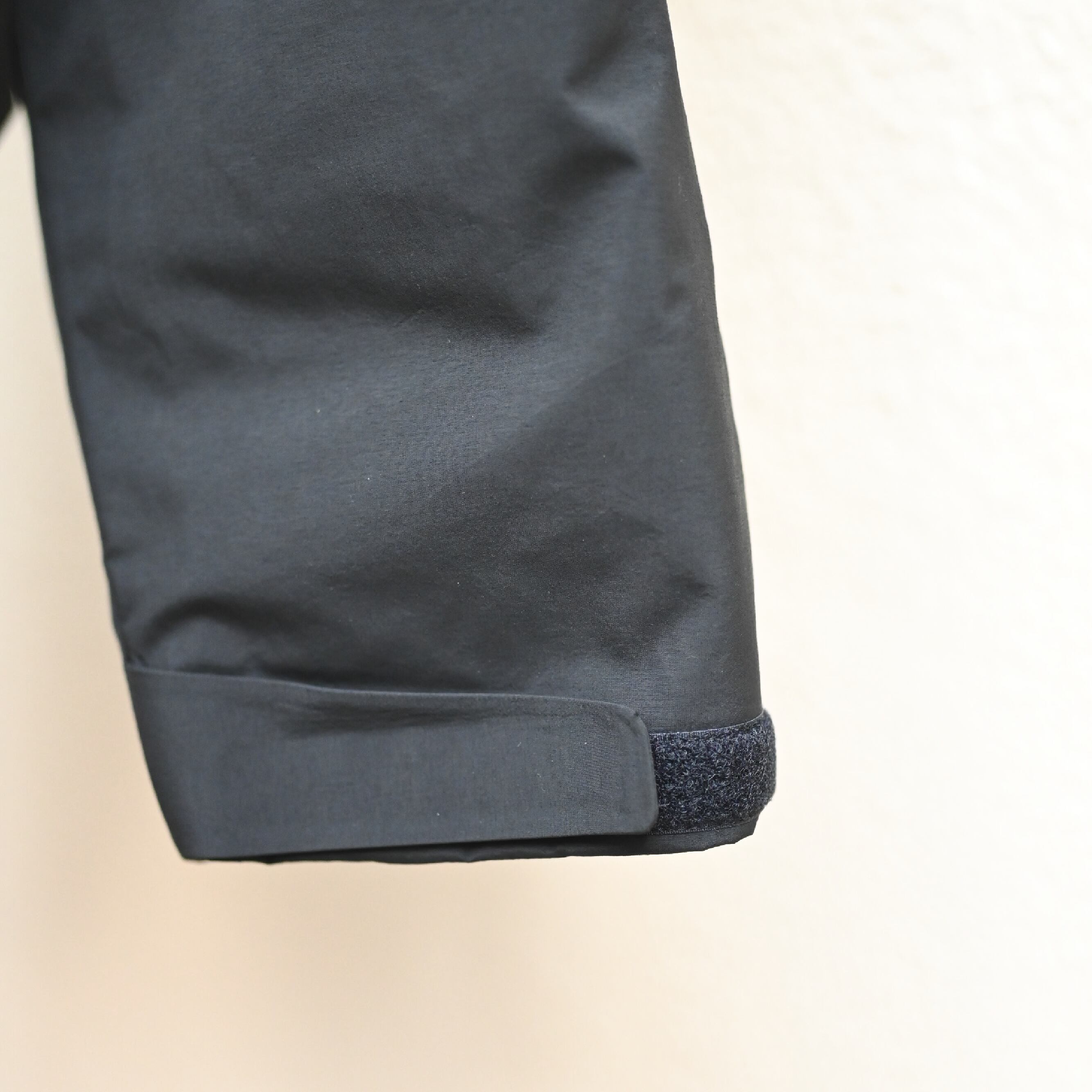 F-001/002 と同じ「耐水圧 10,000mm、透湿度 10,000g/m2/24h」の3layer生地を使用して、完全防水タイプのダウンブルゾンを作成。表地の縫い代には全箇所シームテープを貼り付け、止水ファスナーを採用し、本格的なディティールのダウンパーカーになります。ネックは口元を覆うほどの高さがあり、袖口はテープで調整可、裾はドローコード付きと、生地・デザイン共に機能的でシックな仕上がりとなっています。