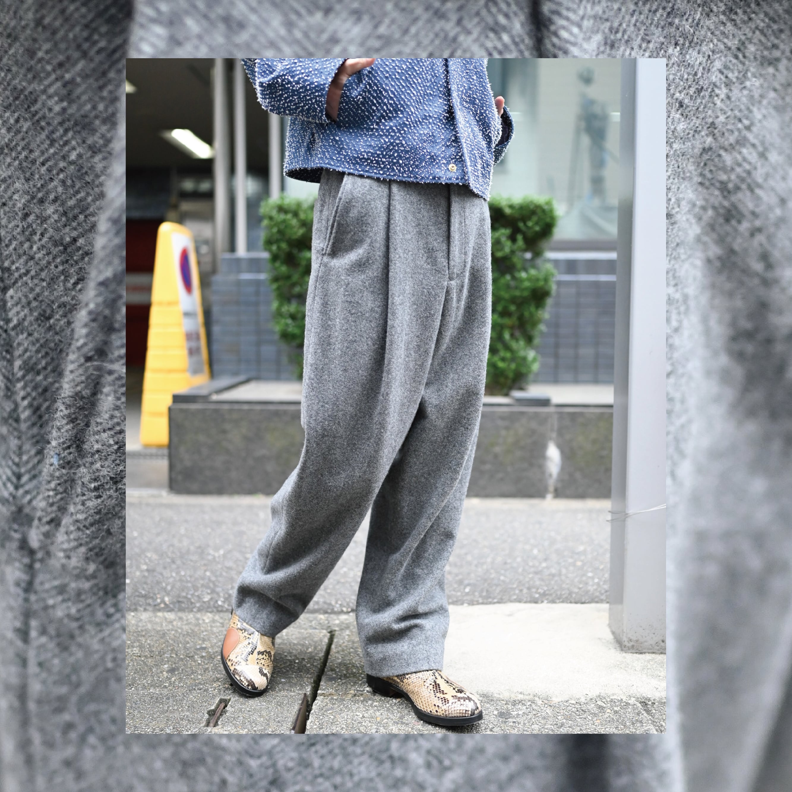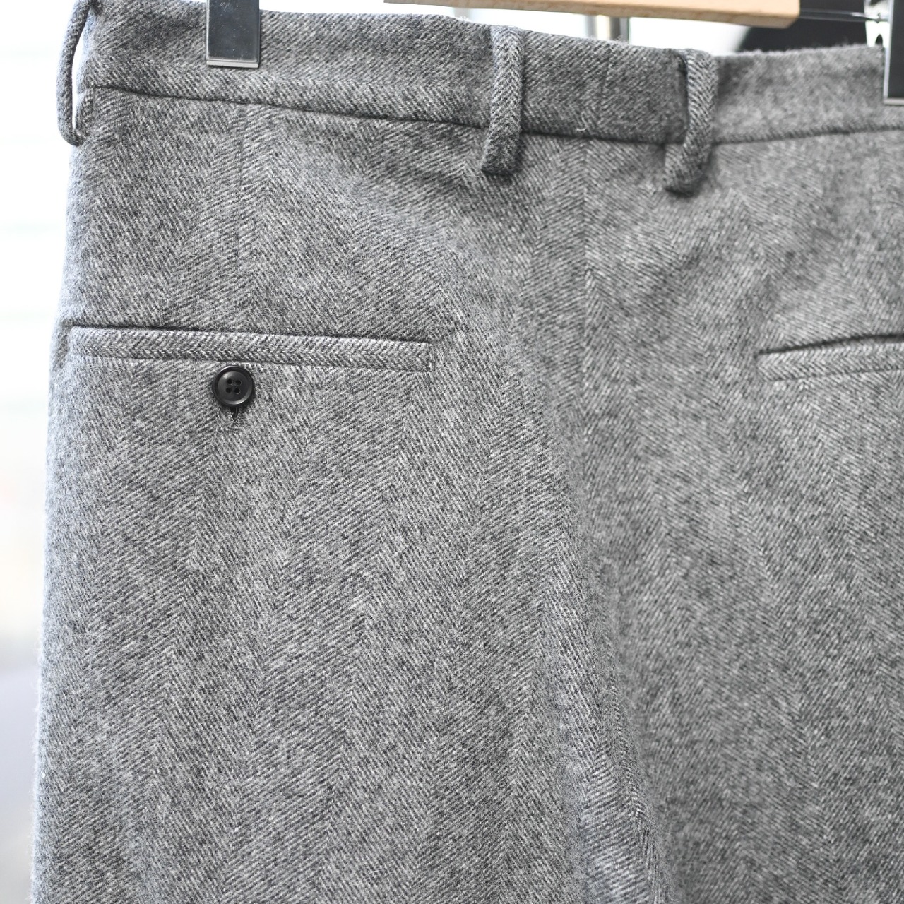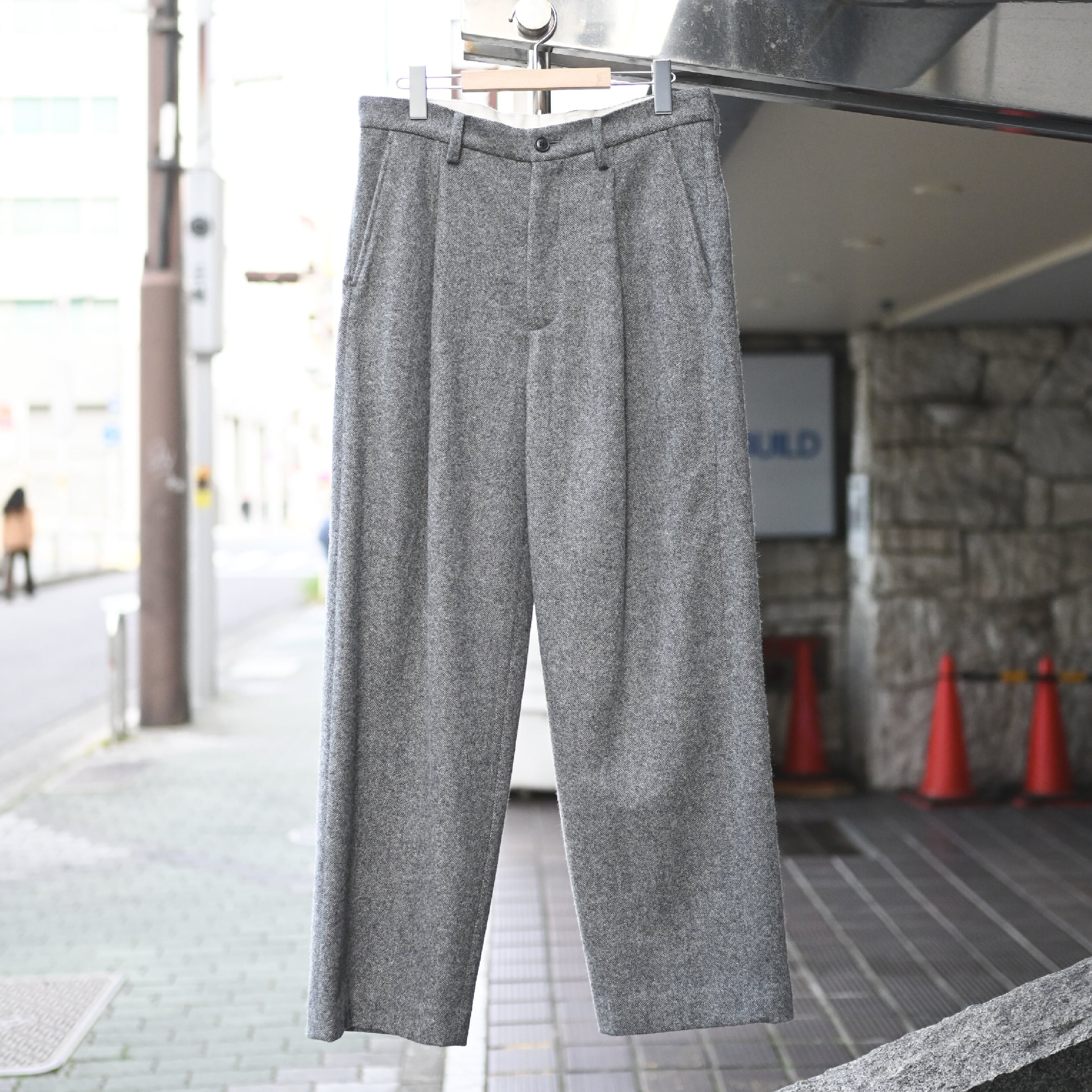 柔らかな肌触りと軽やかな表情が特徴のウールツイード素材を使用した1タックパンツ。