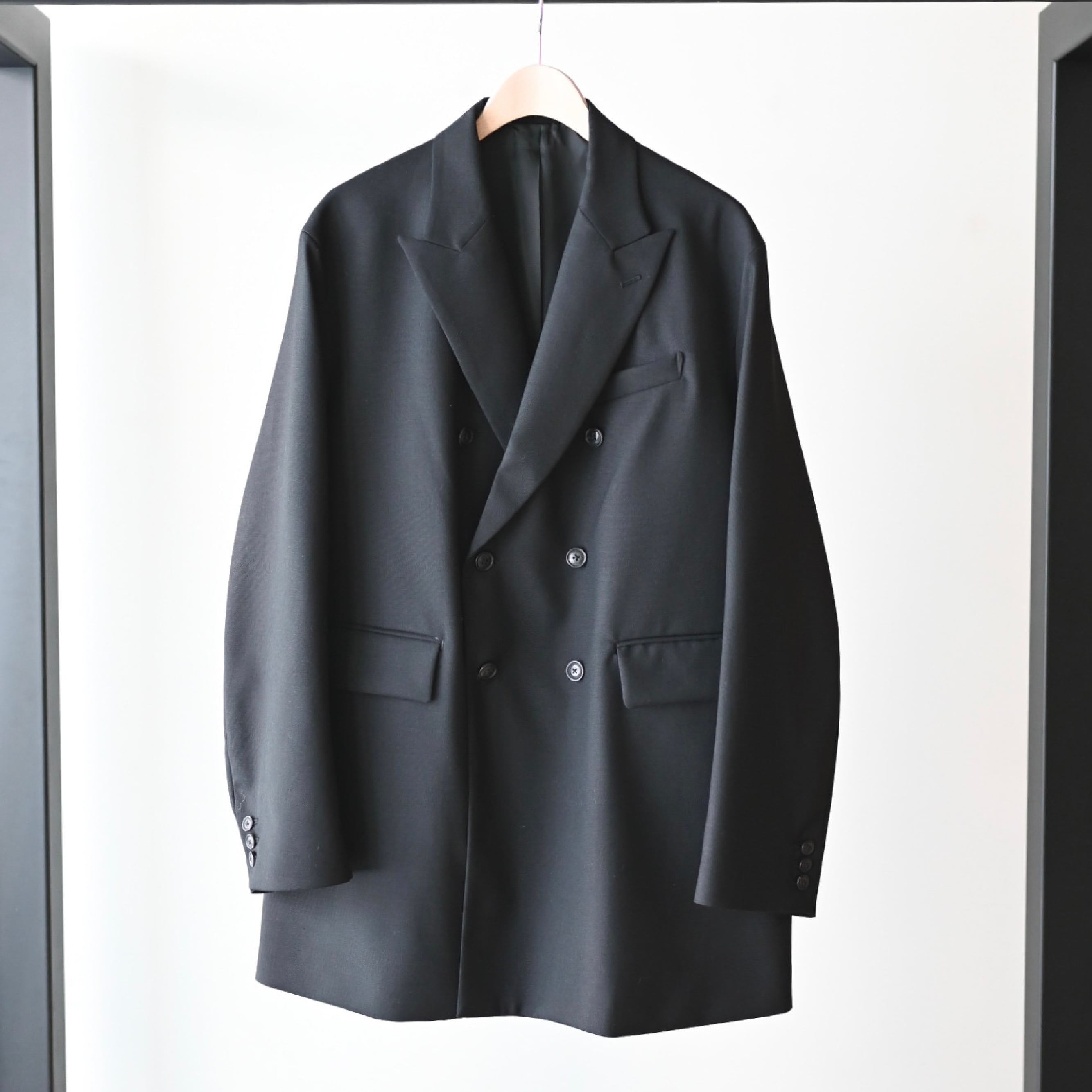 適度な厚みとドライタッチで品の良い光沢感が特徴なウール素材を使用したダブルジャケット。