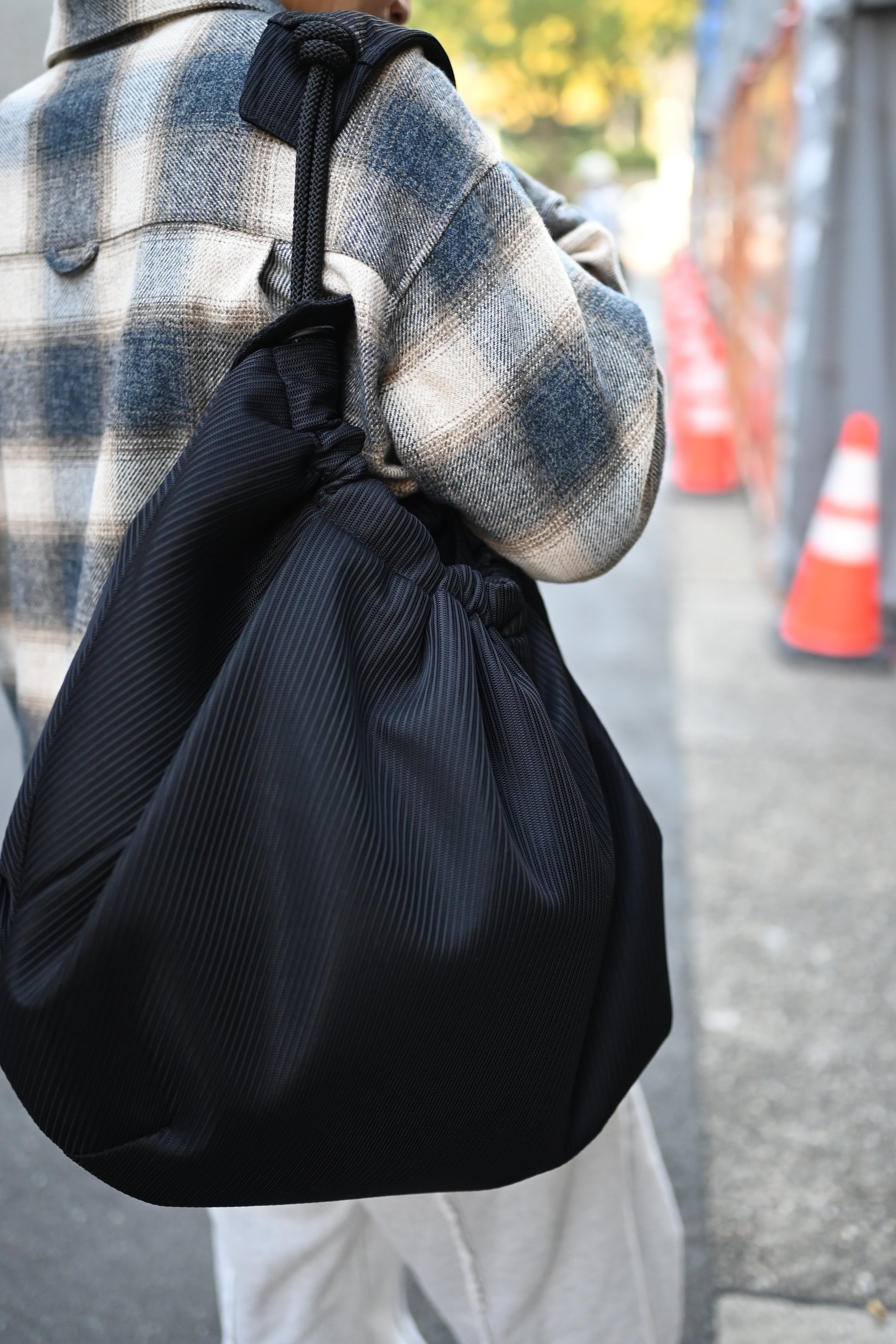 カーシートやクッション材としても使用されるダ ブルラッセル素材を採用し、軽さと耐久性を両立したバッグ。ショルダーでも、トートでも、シーンに応じて表情を変える2WAY仕様。ロープディテールは調整機能だけでなく、デザインのアクセントとしても◎タックを施すことで、ころんとした丸みのあるフォルムで、カジュアルすぎず、上品な存在感を放ちます。